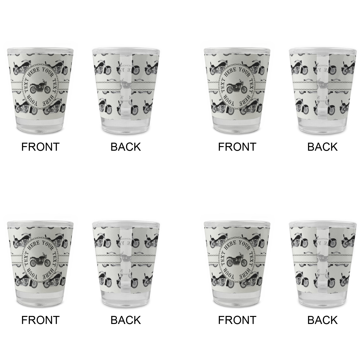 Made with frosted glass, these shot glasses are printed in full color with the design of your choice. They are a standard 1.5oz shot glass and are 2.4" tall. The print is wrapped around the shot glass in a full wrap and boldly displays your customization.