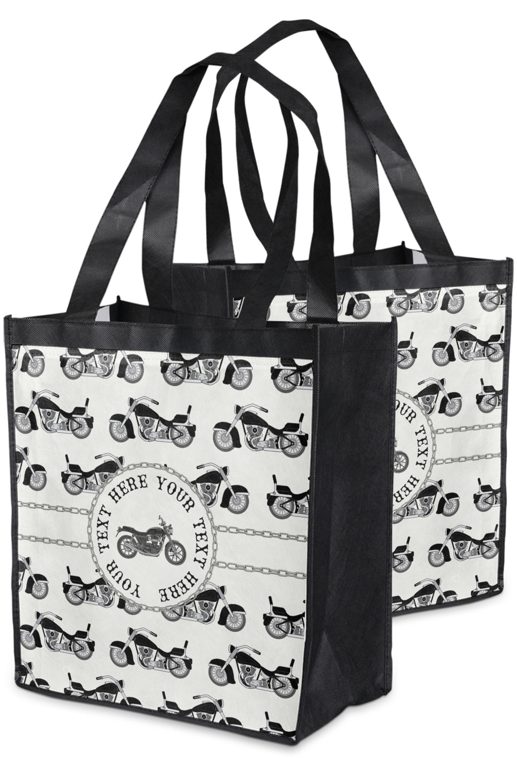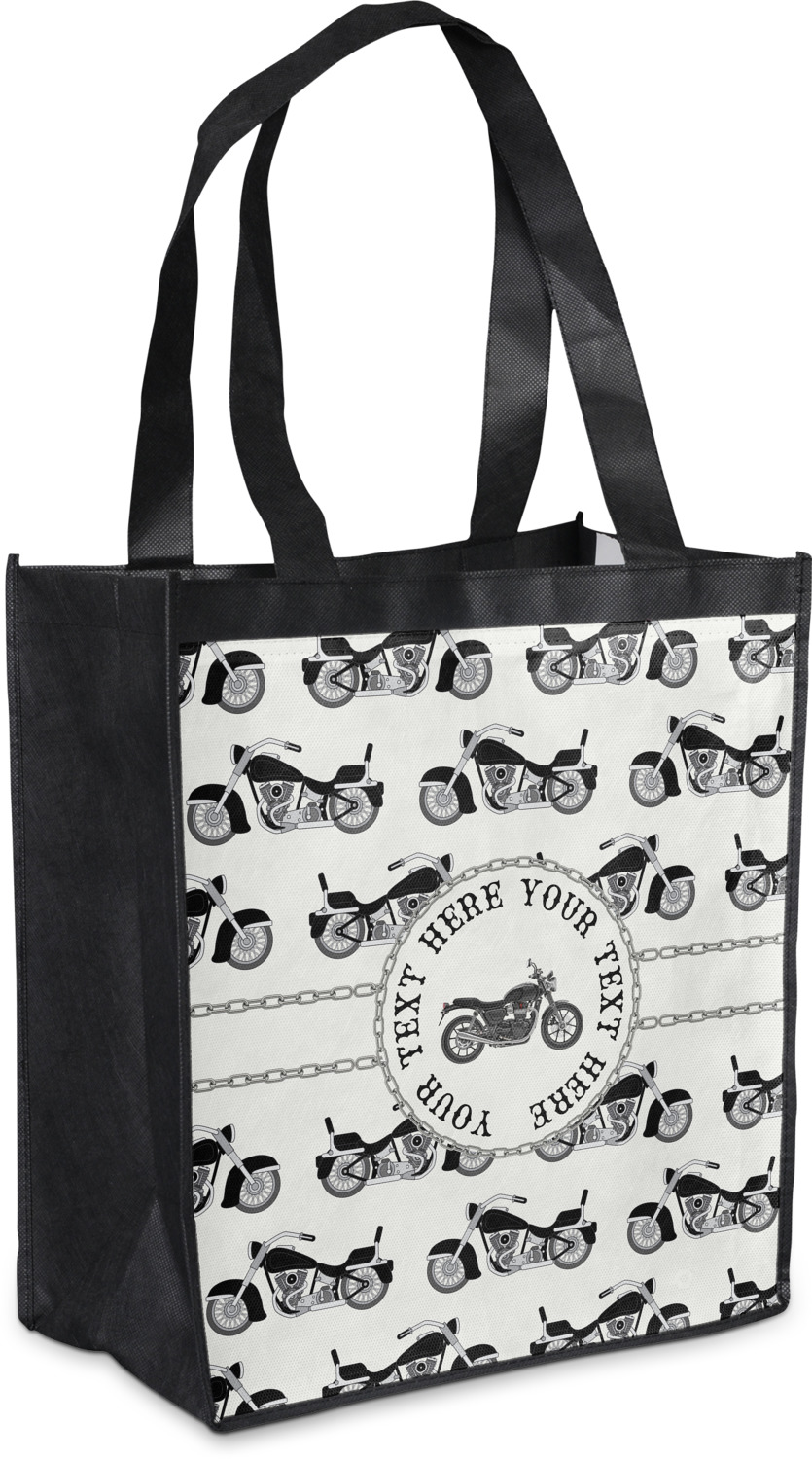 Made from a durable, biodegradable material, these reusable shopping bags can support up to 30 pounds of weight. With two large handles, measuring at 8.5 inches each, these personalized tote bags are easy to carry to your vehicle or home. The bag itself is 12 by 13.5 inches, and can expand to a depth of 7 inches. Your customization is printed on both the front and back, while the remaining sides, trim, and handle are a sleek, charcoal black.