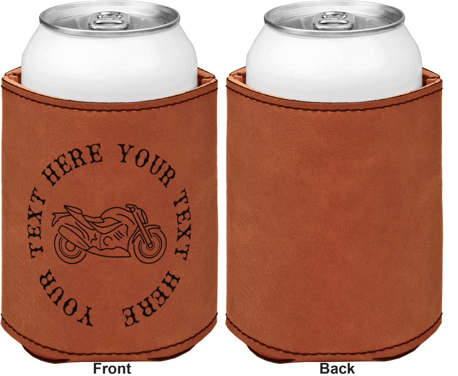 This can sleeve is made from a cognac-brown leatherette and stitched with a sturdy, black thread. A slim padding lines the inside of your can sleeve to allow for a better fit once your drink is inserted. The sleeve itself measures at 4 by 4.5 inches, allowing this custom can sleeve to accommodate most canned drinks. Your personalized design can be engraved on the front and back, or solely the front. When laser-engraved, your design appears as a black coloration which contrasts the leatherette nicely.