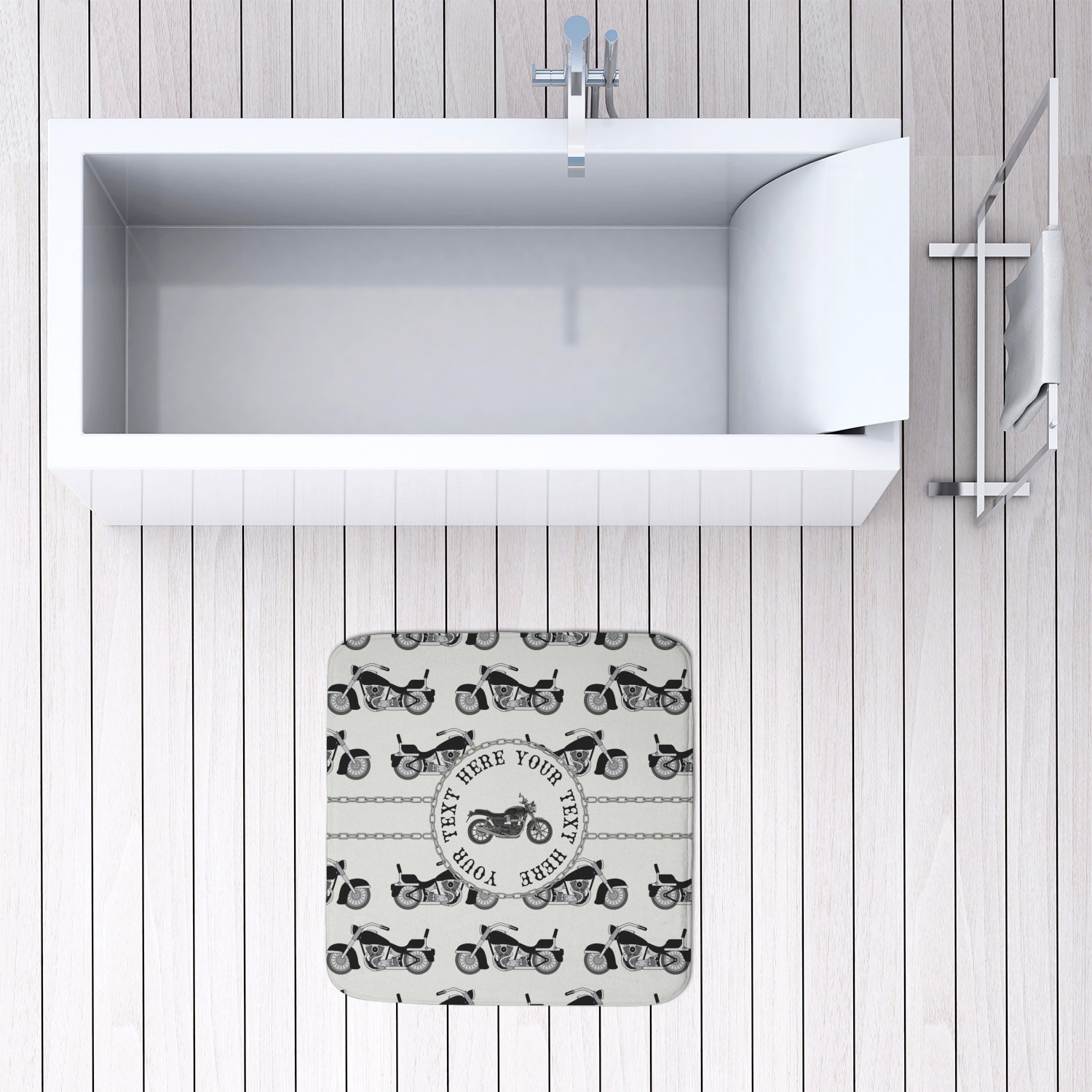 We offer this custom bath mat in four different sizes, so that you can choose the proper size for your bathroom and shower space. We suggest measuring the area before so that you can make an informed purchase. The four sizes are as follows: 24 by 17 inches, 34 by 21 inches, 48 by 36 inches, and 48 by 48 inches.