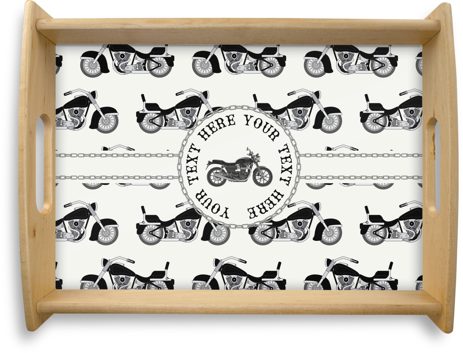 This serving tray with handles features square edges and two rounded sides, creating a very modern look. Each side is fabricated from a beautifully cut, natural wood. The bottom of the interior of the tray displays your customized design in bright, vibrant color. The tray is sold in both a black color and a natural wood look. Each variation of the wood serving tray has two sizes: Small, which is 14" x 10" x 2.25", and Large, which is 19.5" x 13.5" x 2.75".