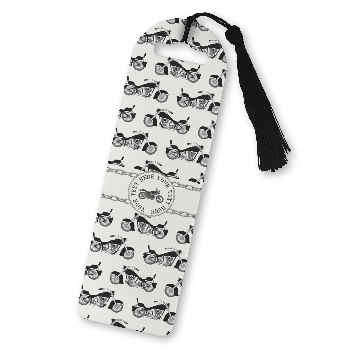 Made from a durable, flexible plastic, these bookmarks are printed with your custom design on them. With the tassel on them they make it easy to find your page in your book. These are a rectangular shape 7 1/4 inches tall with a rounded top and are approximately 2 1/4 inches wide.