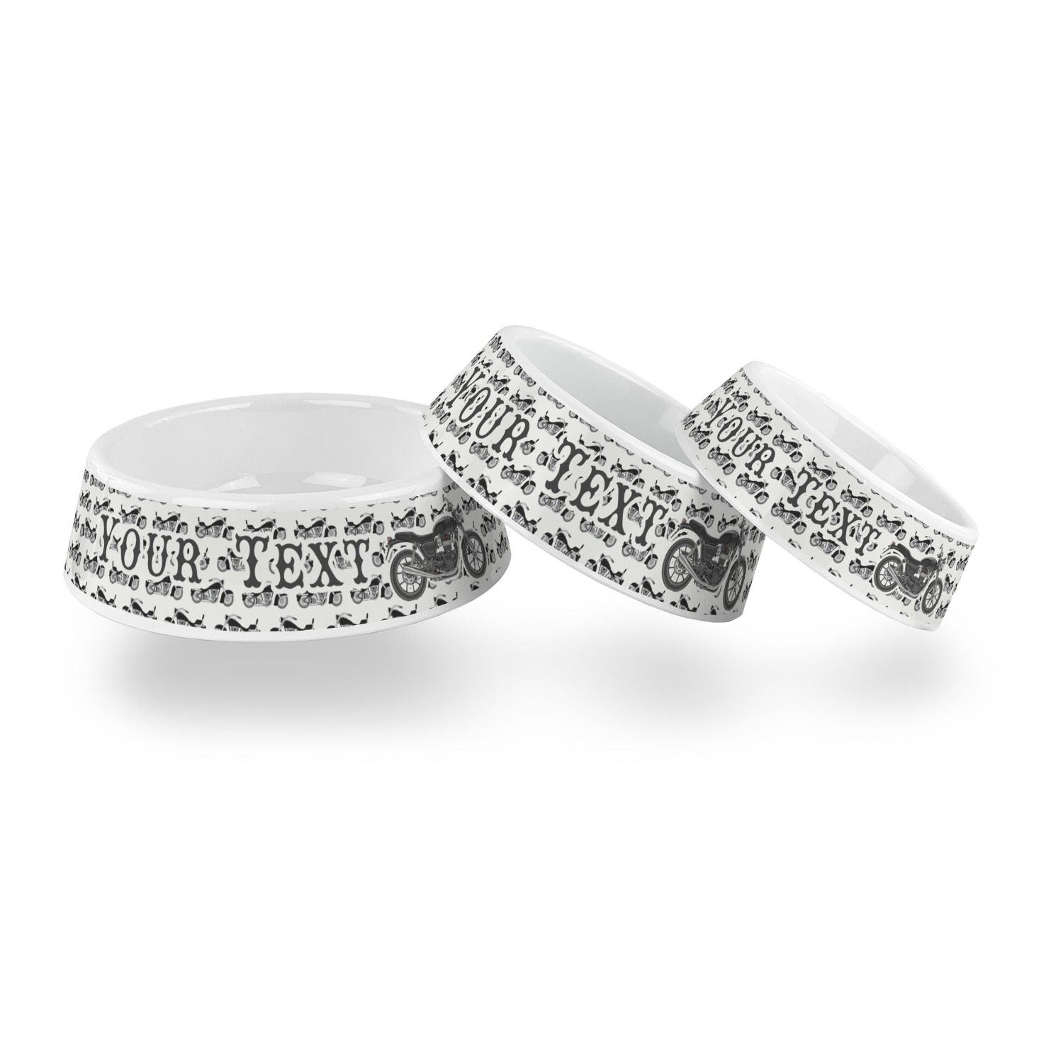 Made from a nearly indestructible composite polymer plastic these bowls come in 3 different sizes to suit any breed of dog. The small bowl measures approximately 5 in diameter and 1.75 tall and holds approximately 1.5 cups of food or water. The medium bowl measures approximately 6 in diameter and 2.25 tall and holds approximately 3 cups of food or water. The large bowl measures approximately 7.2 in diameter and 2.25 tall and holds approximately 4.5 cups of food or water. These bowls are microwave and dishwasher safe so no matter what type of food your dog eats it can be easily cleaned up for the next use. Design your own or use one of our 500 plus designs to make these pet bowls uniquely yours.