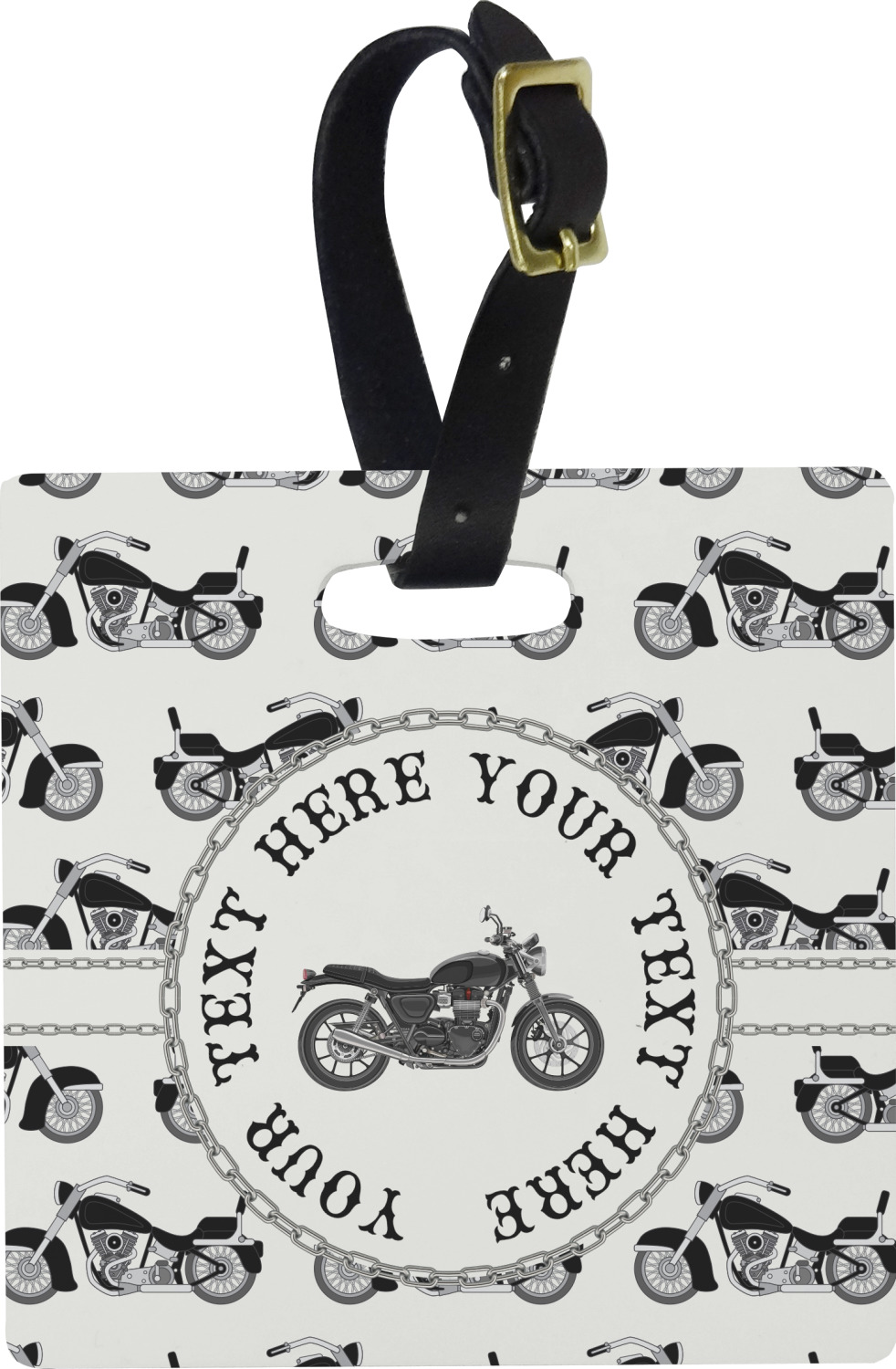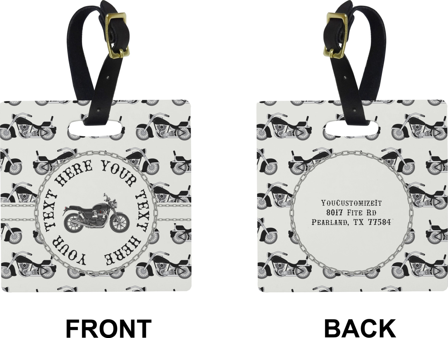 These personalized bag tags are sold in a variety of shapes, so that you may find the product that meets your vision exactly. We sell a round luggage tag, which measures at approximately 4" x 4". Our square luggage tag is about 3.5" x 3.5", while our rectangular version is 2.75" x 4 ".