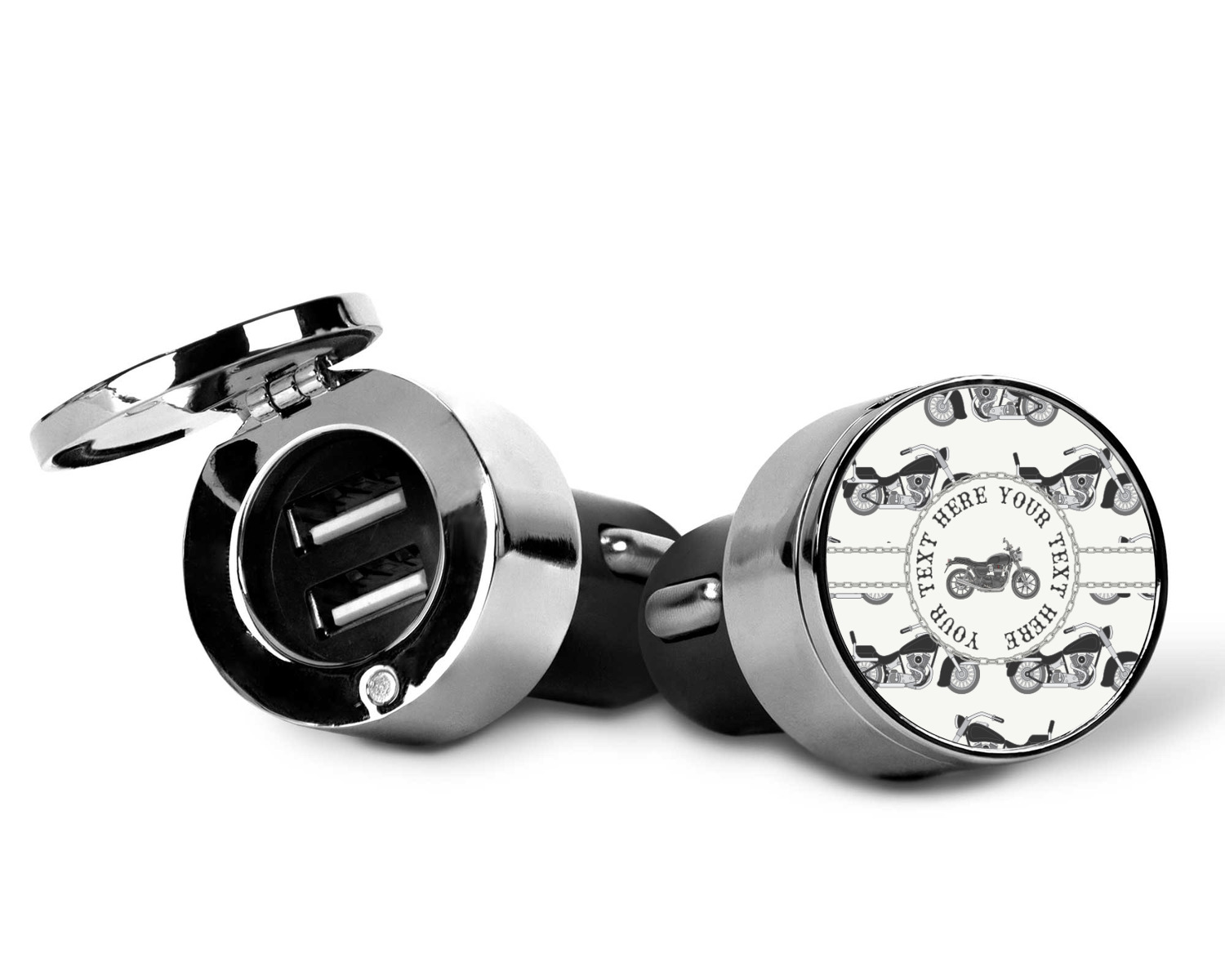 This car charger adapter converts your cars bland cigarette lighter into a decorative, personalized, and operational USB charging port. Made of solid, silver-plated metal, these chargers feature a flip-open lid that both displays your customized design and conceals two USB ports. The metal lid of the USB car charger adapter is 1.5" in diameter and seals due to a small, ingrained magnet on both the charger and its lid. The cigarette lighter insert, itself, is colored black.