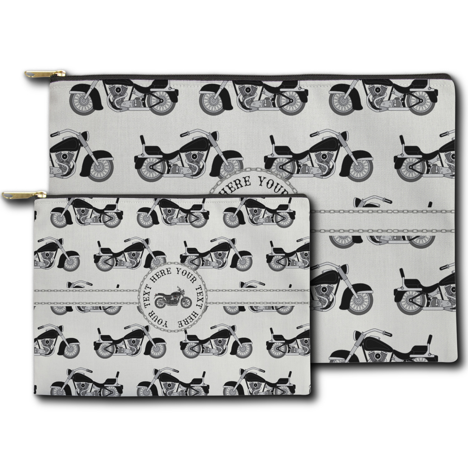 Our zippered pouches are available in two sizes - small: approx 8.5W"x6H and large: approx 12.5Wx8.5H. The pouches are made from a soft & durable canvas fabric that is printed on the outside with your design; the inside has a fused black lining. The printed canvas fabric is then cut and the pouches are sewn right here in the USA. The zipper itself is gold in color and has a round hook.