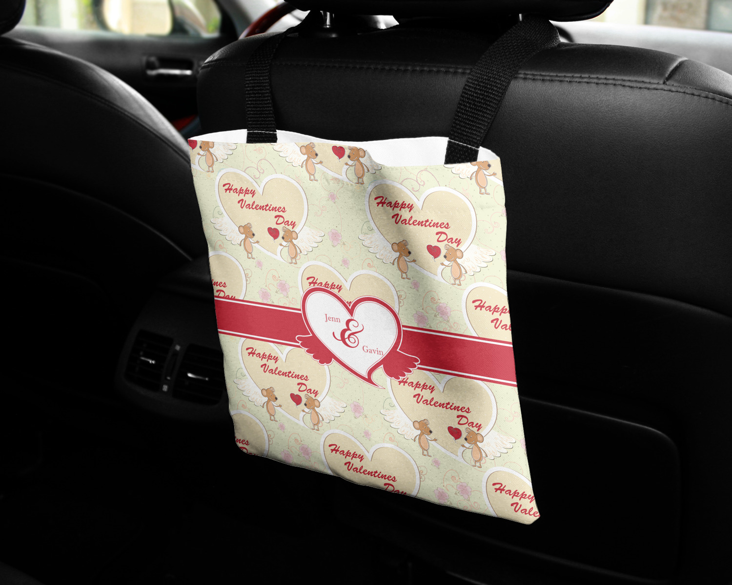 These car back seat organizers are sturdy tote-like bags, fabricated from a robust polyester, and features a single handle on the back side. The strap features an attachable velcro for easy attachment to headrests, grocery carts, car seats, and more. Simply undo the velcro, loop the strap around the headrest, reattach the velcro, and let the organizer hang from the front seat. These car organizers are the perfect means of increasing your backseat's legroom, while storing multiple items in one place for better accessibility. Each car back seat organizer measures at 10 by 10 inches, and features your personalized design printed across its front and back.