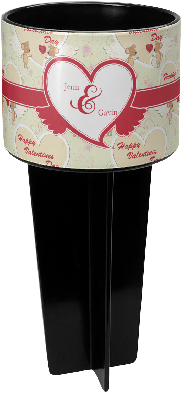 This cup holder has a large stake at its bottom that anchors it to the sand or ground below, while the cup holder rests above the stake. The entire drink holder is made of durable plastic and displays your customization around the cup holder portion. We sell these personalized beach spikers in two different colors: black and white.