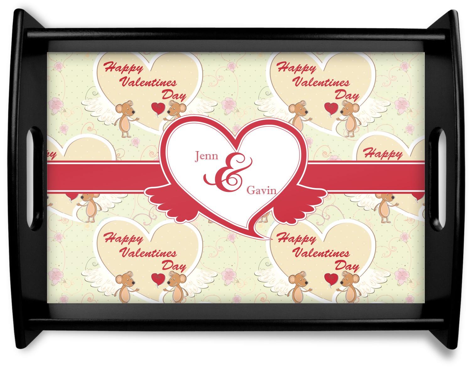 This serving tray with handles features square edges and two rounded sides, creating a very modern look. Each side is fabricated from a beautifully cut, natural wood. The bottom of the interior of the tray displays your customized design in bright, vibrant color. The tray is sold in both a black color and a natural wood look. Each variation of the wood serving tray has two sizes: Small, which is 14" x 10" x 2.25", and Large, which is 19.5" x 13.5" x 2.75".