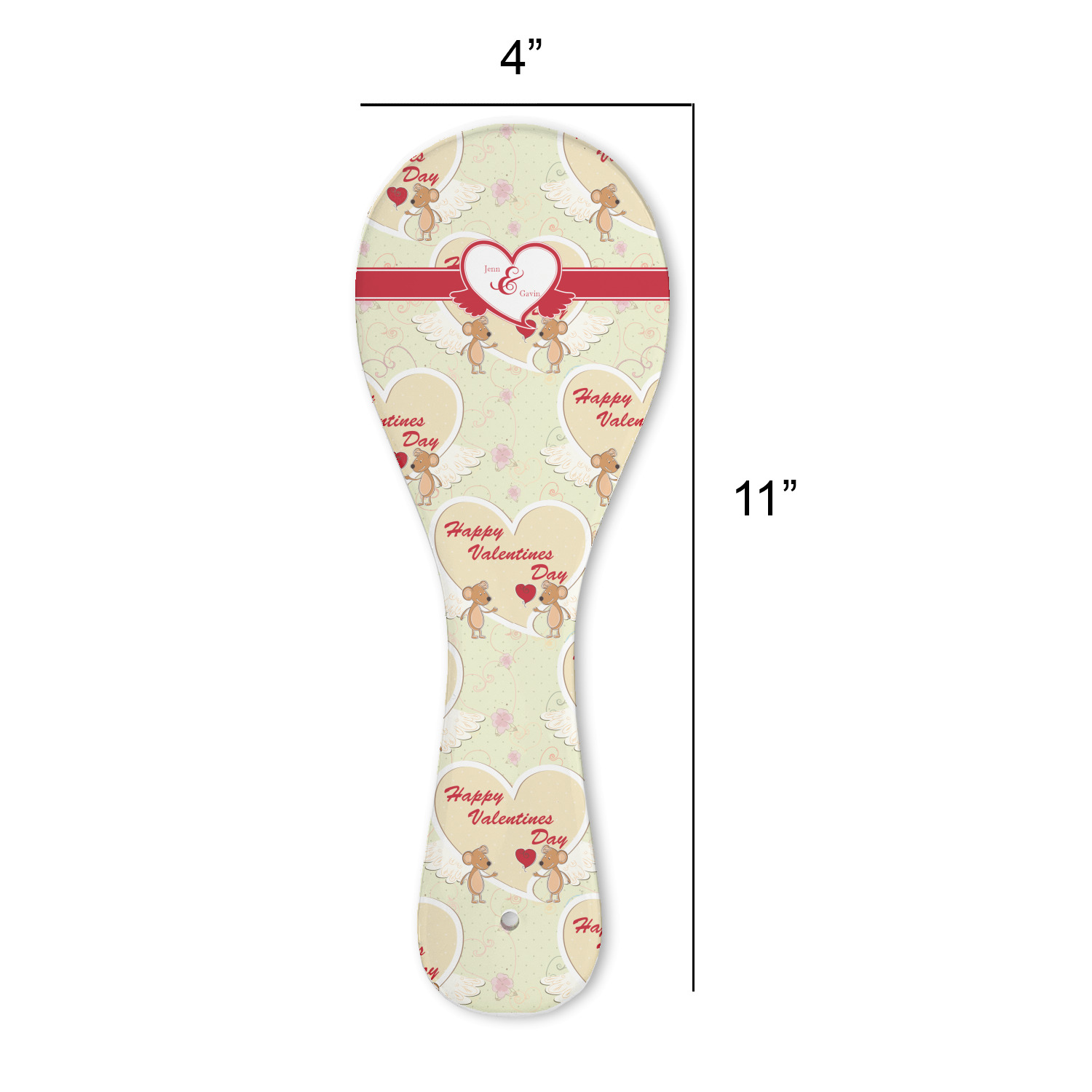 Made from a durable ceramic with a raised foot backer, these spoon rests are 11" long, 4" wide at the spoon section - 2.25" wide at the handle, and stand 0.375" tall. The spoon rest end has a slightly dished out area to ensure any items spilled on it do not run off. On the handle there is a hole in case you want to use it as a decoration in your kitchen it is easy to place on the wall.