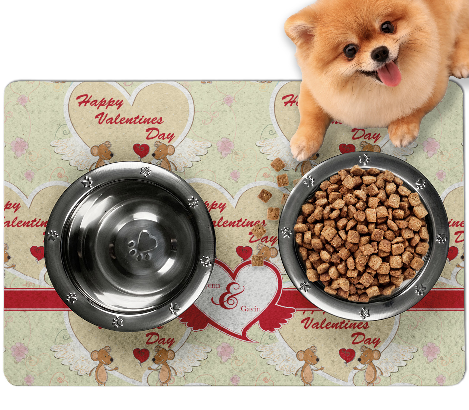 This dog bowl mat, fabricated from polyester, proudly displays your customized design on its top, while its bottom includes a non-slip rubber. This feature allows it to remain firmly in place, even when your dog spills his/her water. With 3 sizes available (18" x 12", 24" x 18", 30" x 24"), the pet food mat has ample space for both a food and water bowl for any sized dogs. Though specified for dogs' use, these mats are also a splendid option for cats.