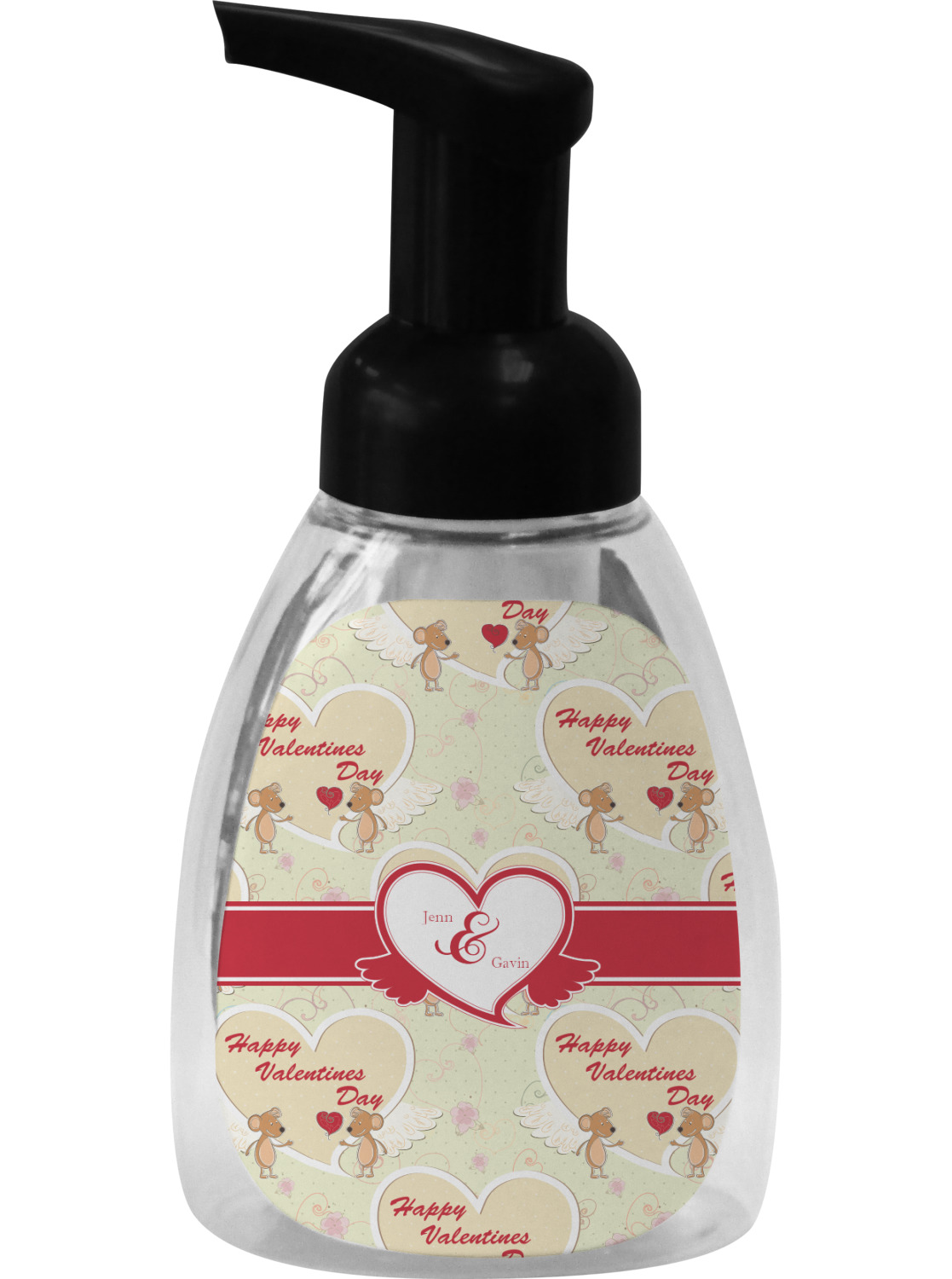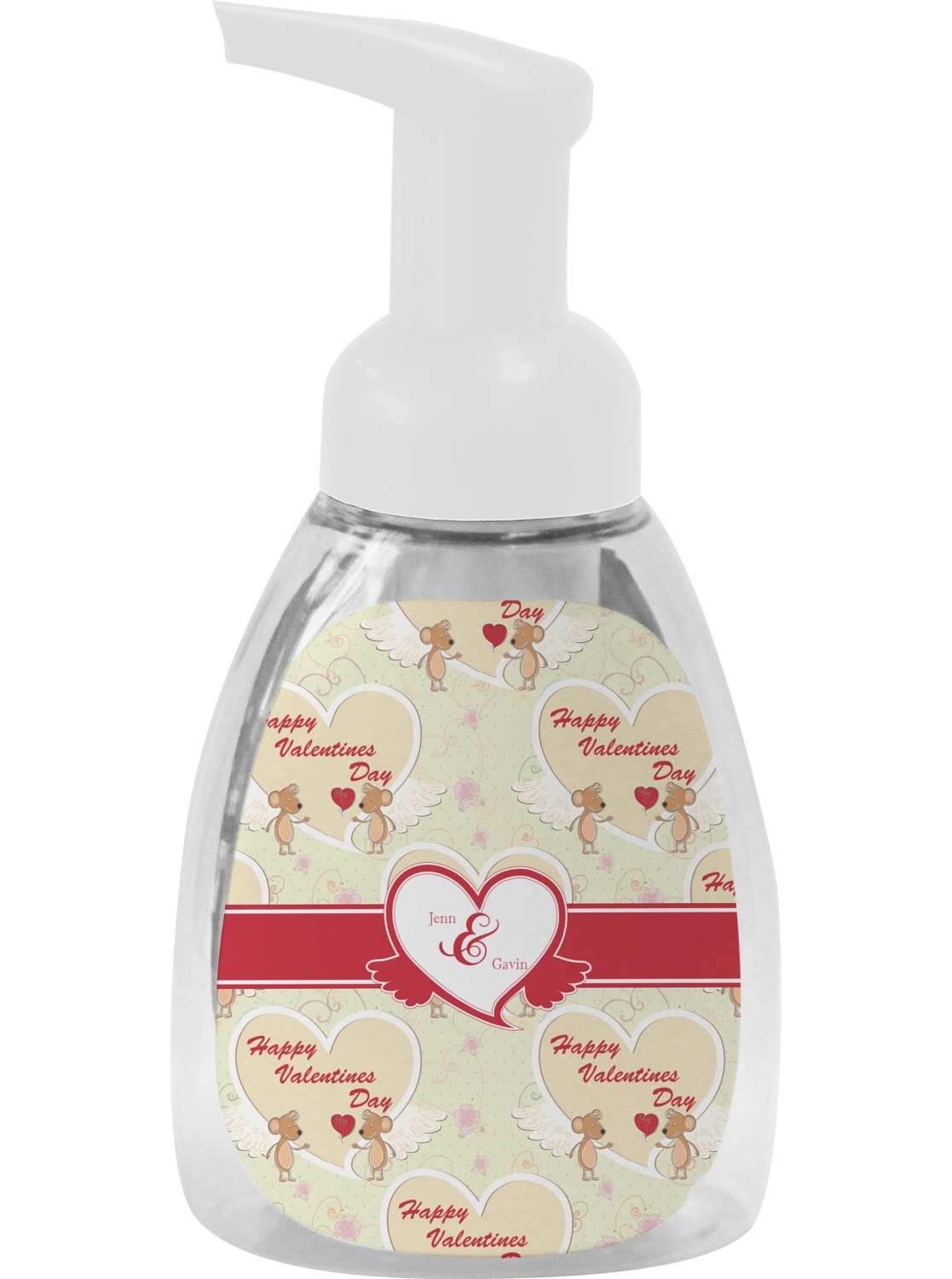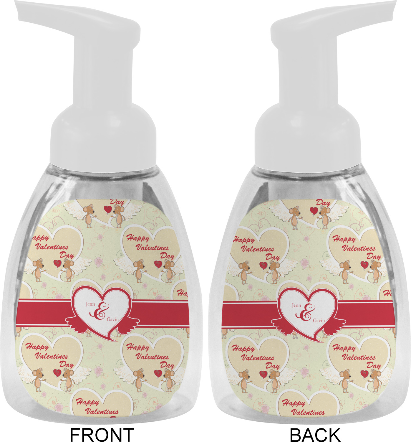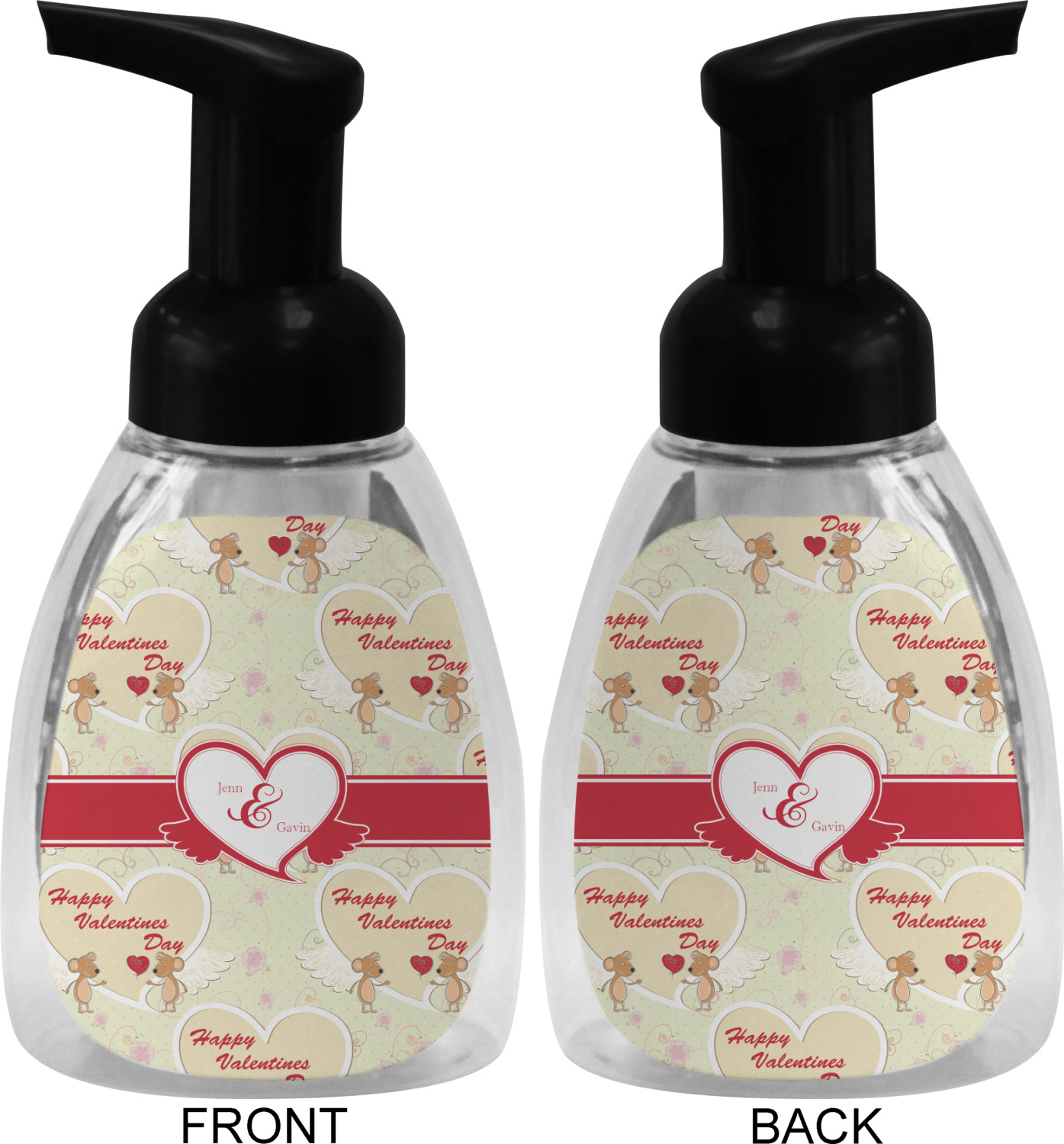 This soap dispenser is made of a robust plastic and has a clear base. The included soap pump is available in black or white color. This dispenser is 6.5 inches tall, 3 inches wide, and 2 inches deep. We display your customized designs on the front and back sides of these foaming hand soap dispensers.