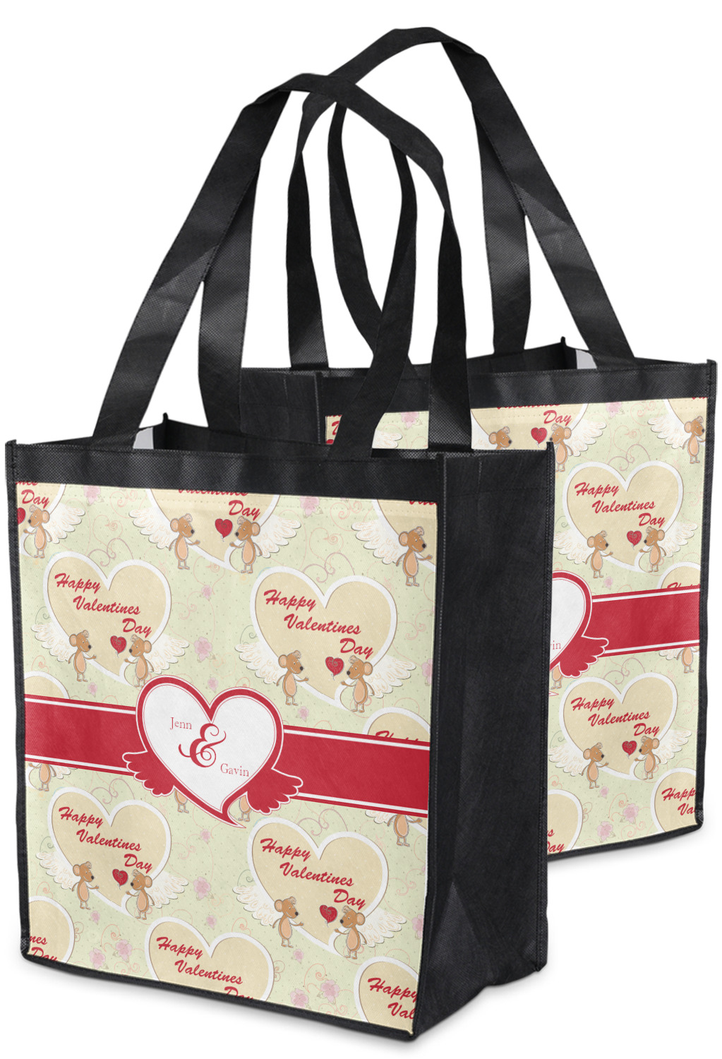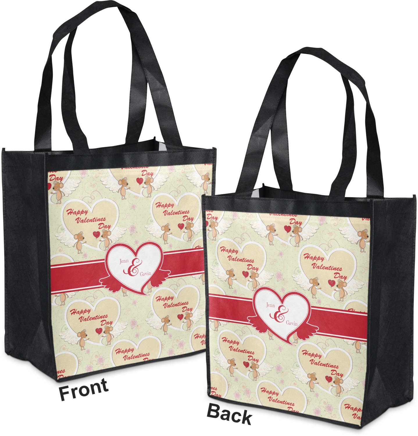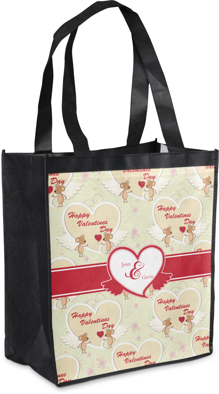 Made from a durable, biodegradable material, these reusable shopping bags can support up to 30 pounds of weight. With two large handles, measuring at 8.5 inches each, these personalized tote bags are easy to carry to your vehicle or home. The bag itself is 12 by 13.5 inches, and can expand to a depth of 7 inches. Your customization is printed on both the front and back, while the remaining sides, trim, and handle are a sleek, charcoal black.