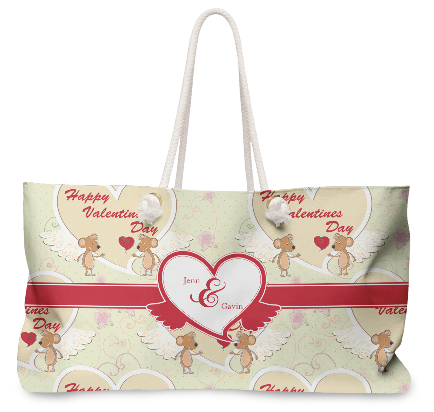 Our oversized weekender tote with rope handles is perfect for your weekend at the beach or on the town. This large tote are 24" W X 13" H, with a 5" gusset and a 27" thick rope handles with a knot that is put through a grommeted brass hole.
