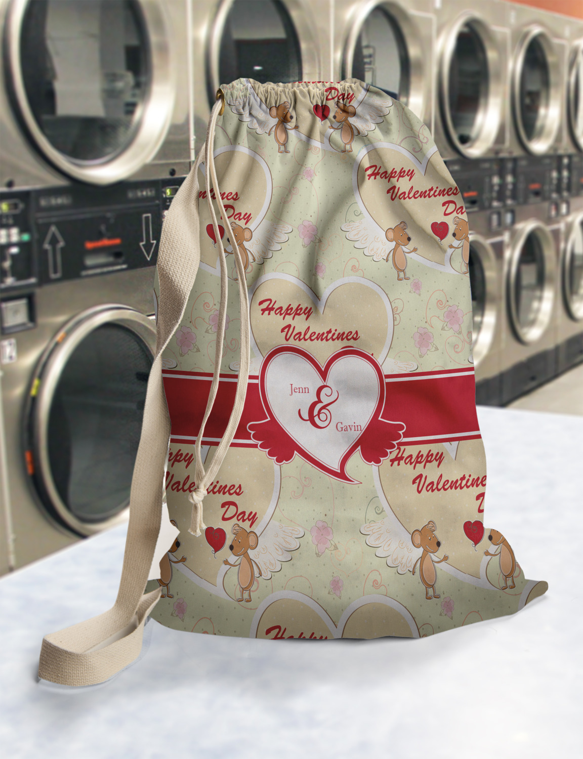 Carry your laundry in style with these customized laundry bags. Available in two sizes, featuring a natural colored woven strap and a cinch cord, these bags hold a lot of clothes or anything else you want to fit in them.