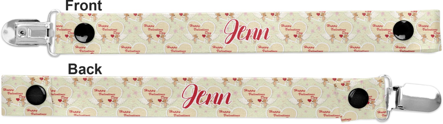 This personalized pacifier clip is the ideal size and measures at approximately 7.5 inches in length, when either end is snapped closed. On one end, you'll find a snap button. This button of your baby's pacifier holder is what can be attached to their pacifier to hold is securely in place. Simply open the snap, slip it through the pacifier opening, and snap it back into place. On the opposite end of this baby pacifier holder, you'll find a metal clip that can secure to a baby's collar or sleeve. This clip ensures that the strap stays in place, and that your baby's pacifier is always on hand.