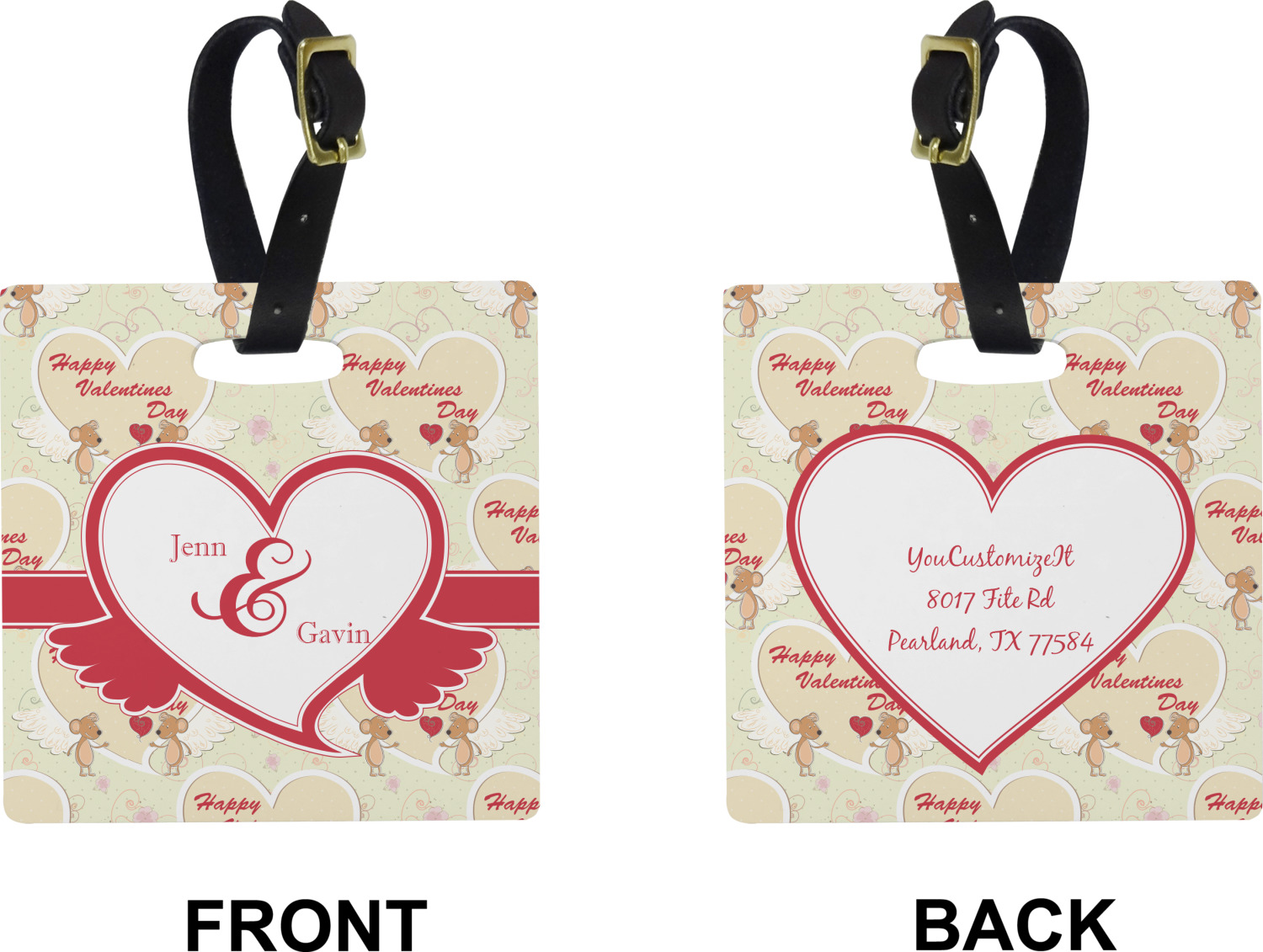 These personalized bag tags are sold in a variety of shapes, so that you may find the product that meets your vision exactly. We sell a round luggage tag, which measures at approximately 4" x 4". Our square luggage tag is about 3.5" x 3.5", while our rectangular version is 2.75" x 4 ".