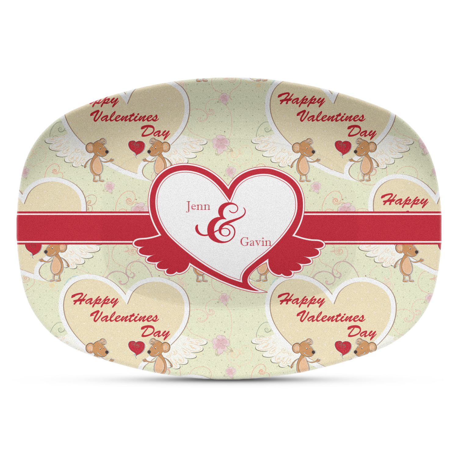 These serving platters are made from a composite, thermo-set, polymer plastic that gives it the versatility, durability, and weight of a melamine platter, without any of the downsides of melamine. These personalized platters, can withstand temperatures up to 250 degrees Fahrenheit, for up to 60 minutes. No harmful chemicals, such as BPA, formaldehyde, and DEHPs were used in the manufacturing of this product. This large serving platter measures at 14" x 10.25", and is spacious enough to hold any of your appetizers or bite-sized desserts. The platter exhibits your personalization across the entirety of its front.