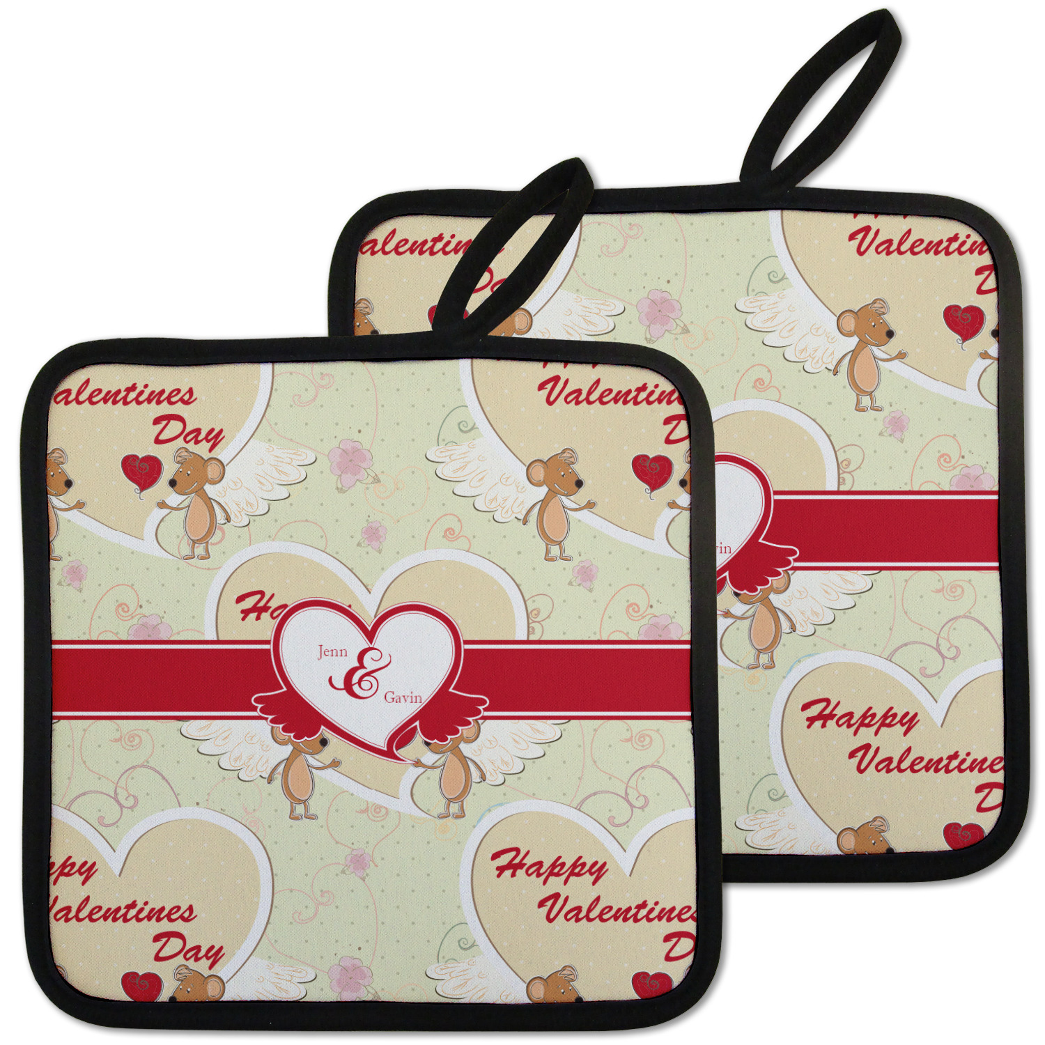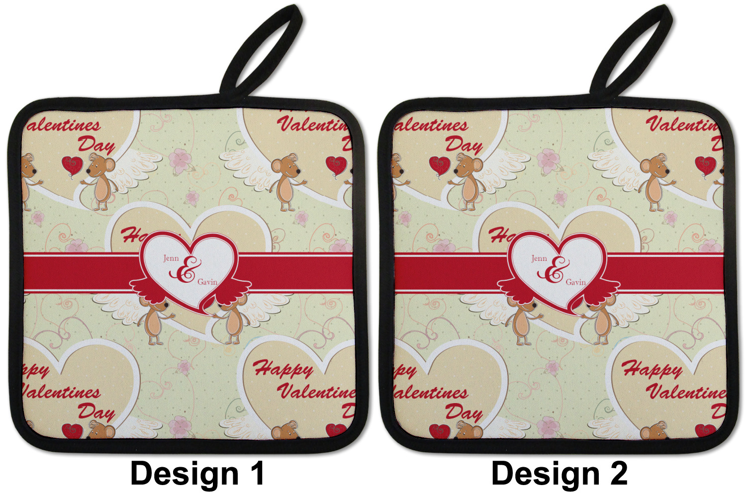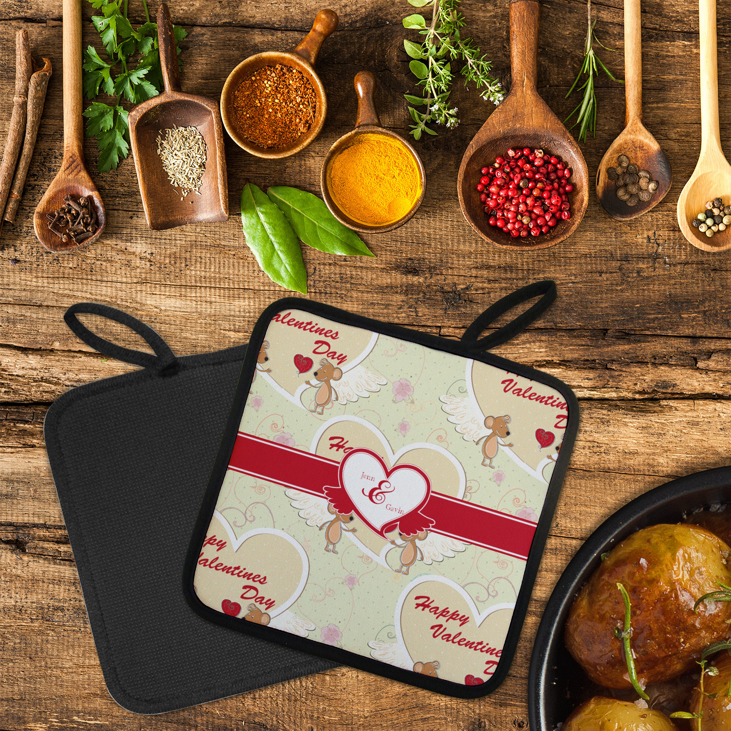 Our personalized pot holders feature a neoprene front that displays your personalization in vibrant colors. The backing of the hot pot holder is rubberized; the textured backing allows you to have a great grip when using this custom pot holder. The two materials are joined with a sleek, black trim, and the holder also includes an attached loop for hanging and storage. The pot holder is approximately 8.75 inches by 8.75 inches and 0.25 inches tall, while the fabric loop is 2.5 inches long. You can purchase a kitchen pot holder by itself or as a set of 2. We also offer a set including one pot holder and one oven mitt.