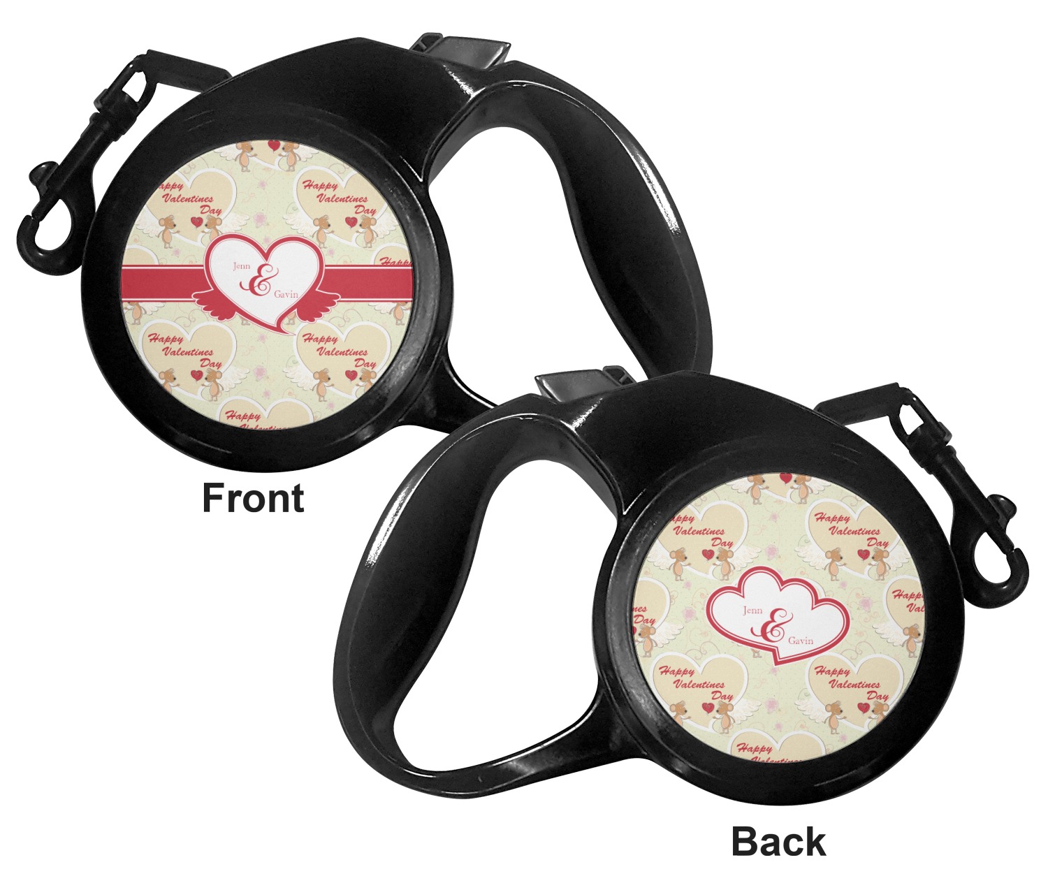 The leash's plastic handle is accommodating of your grip and displays your customization on both sides. The dog leash also features the traditional bolt snap clip, for easy fastening to your dog's collar. The leash and leash handle themselves are both black in color.