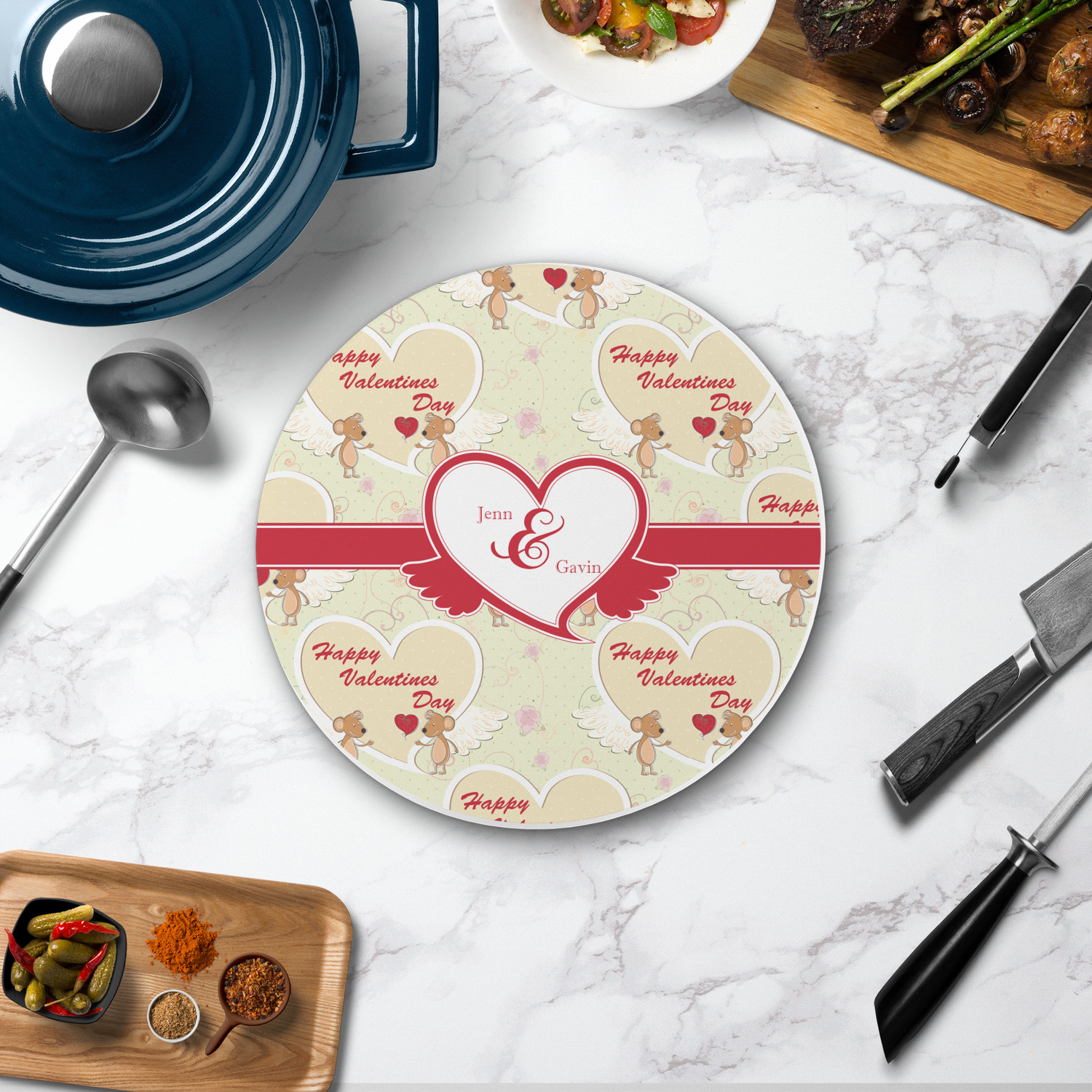The round trivets can be customized with your own design, your own photo, or your own logo. You can add personalization, like a monogram, family name or initial to your uploaded design / art. You can also customize one of our designs and change the patterns, colors, personalization, fonts etc.