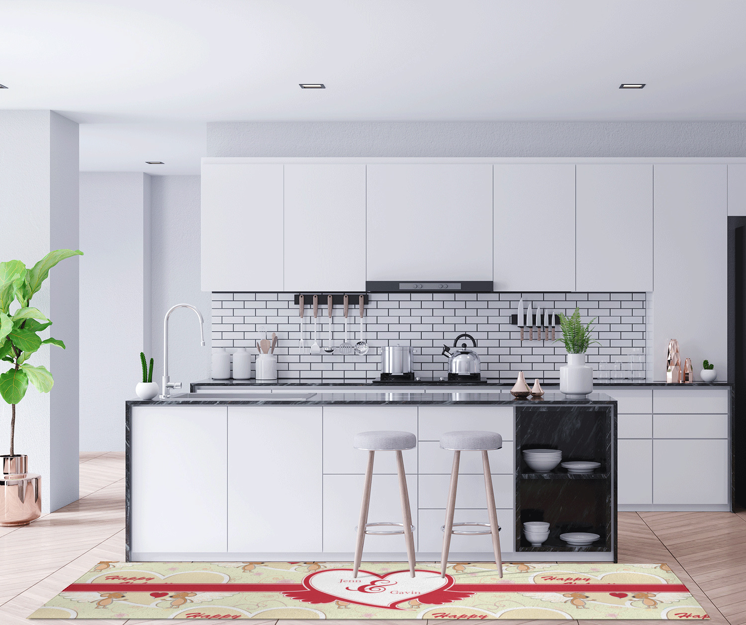 If you want to design it for your hallway - a vertical design is the perfect fit. If designing for to go in front of your kitchen island a horizontal design would suit you best! In our design system you can rotate the design either way to get the product you want.