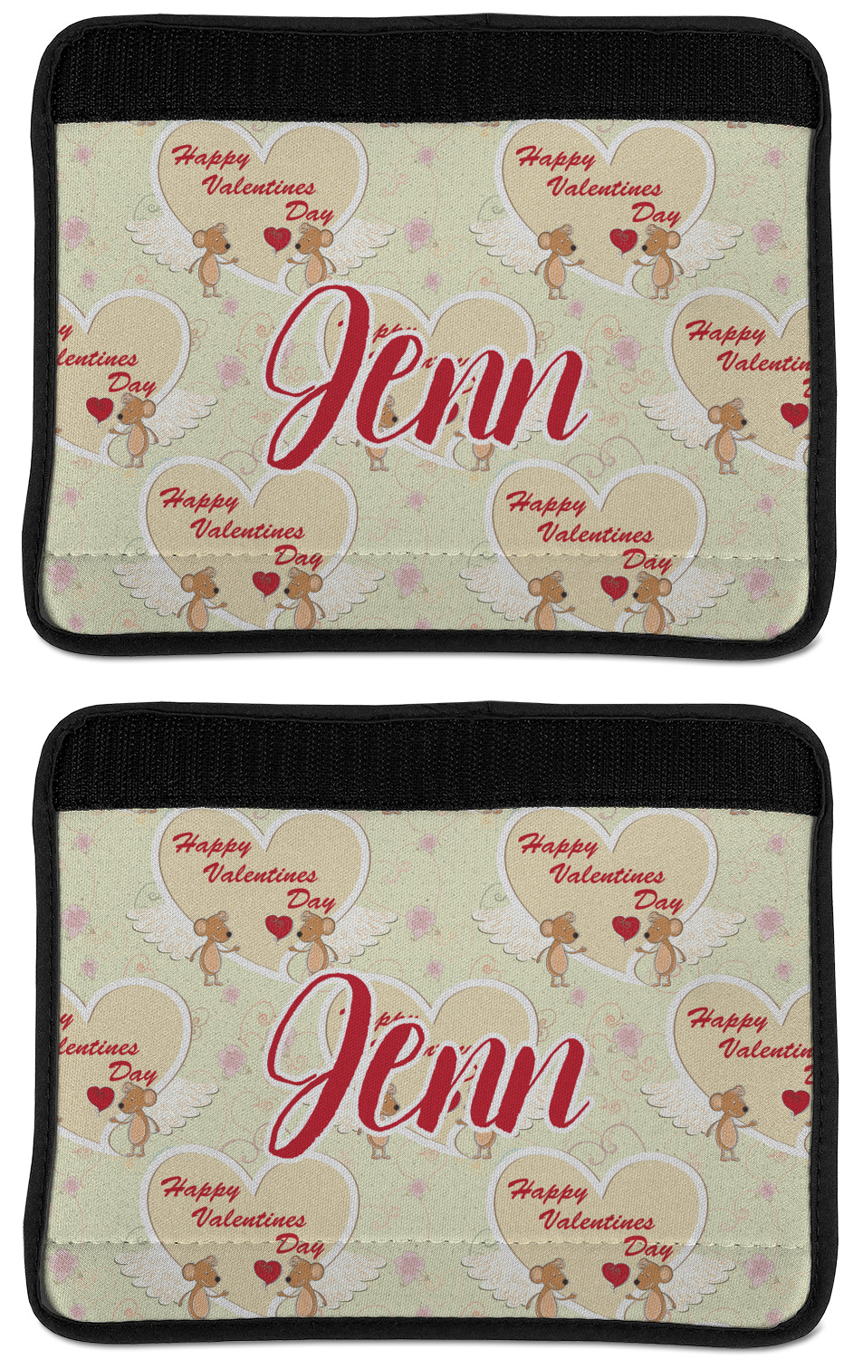 Made from neoprene, our seat belt strap covers wrap around the belt itself and have a Velcro tab for easy attachment and closure. The belt's edges are trimmed with a black polyester for a secure finish. Each cover is 9.5 by 7 inches when open and 9.5 by 2.5 inches when closed. We print your personalized design on the face of the seat belt pad.