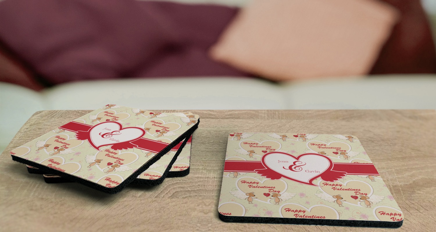 These drink coasters have a smooth, polyester top and a textured, rubber backing on its bottom. The non-slip rubber backing underneath works to keep any spills at bay. At 4 by 4 by 0.25 inches thick, these custom coasters are a suitable size for most drinkware. Your personalization is displayed atop the face of the cup coaster. We sell these rubber coasters in two different shapes: square and round. You can buy each shape as singulars or as a set of 4.