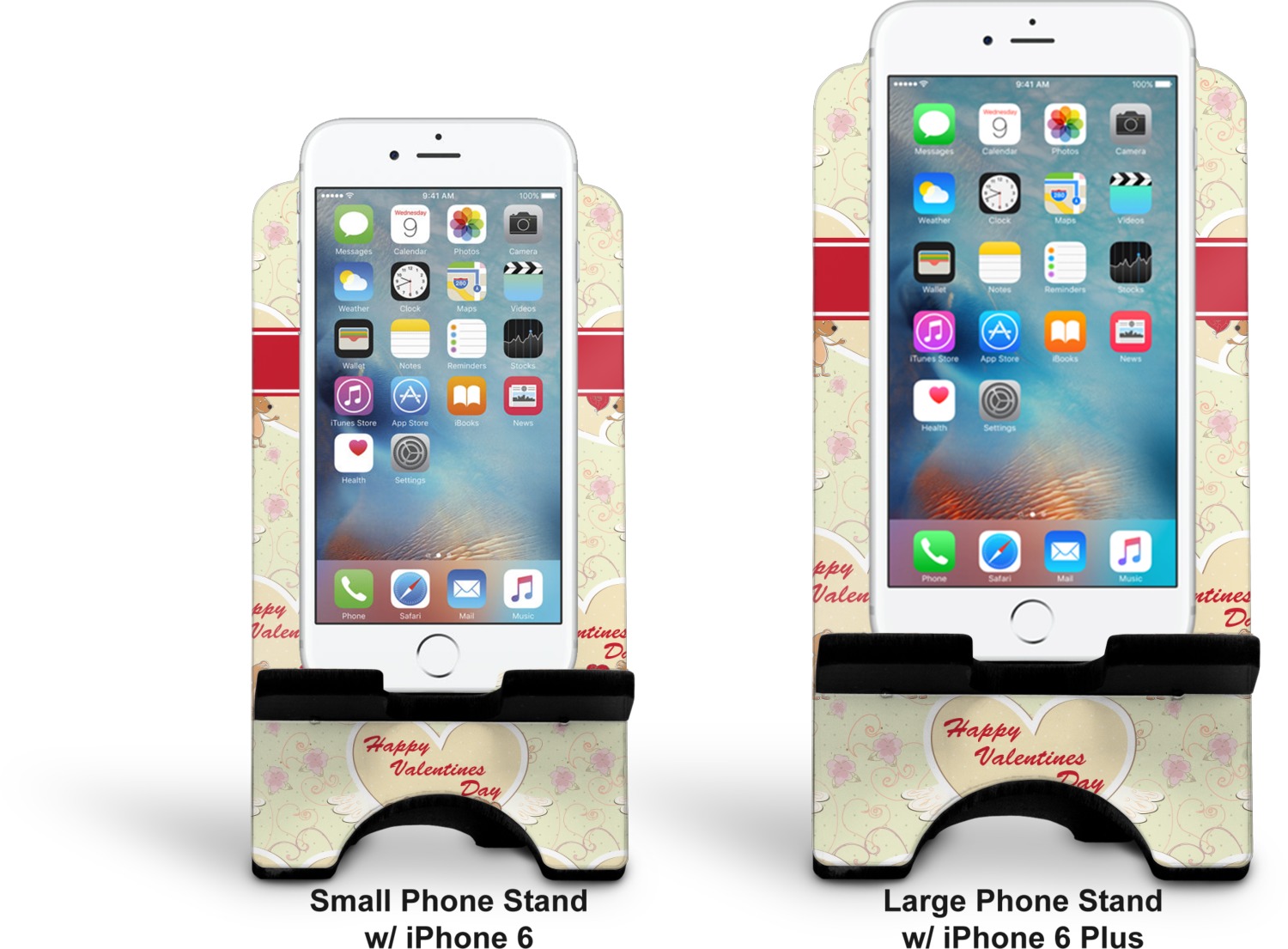 To meet your needs, we offer four variations of this IPhone stand. The backboard of the first version is shaped as a plain, yet sleek rectangle, and is available in two sizes. Our smaller size is approximately 4 by 3.25 by 7 inches, while the larger model is 4 by 3.77 by 8.5 inches. Alongside this model, we also provide you with a more decorative option. The upper part of our second version features a curved edge, for a classy, suave appearance. This phone holder is also sold in two sizes: a smaller version, which is 4 by 3.25 by 7 inches, and our larger model, which is 4 by 3.77 by 8.5 inches. Both models will support large phones, but the larger model is better if you wish to proudly display your personalized design.