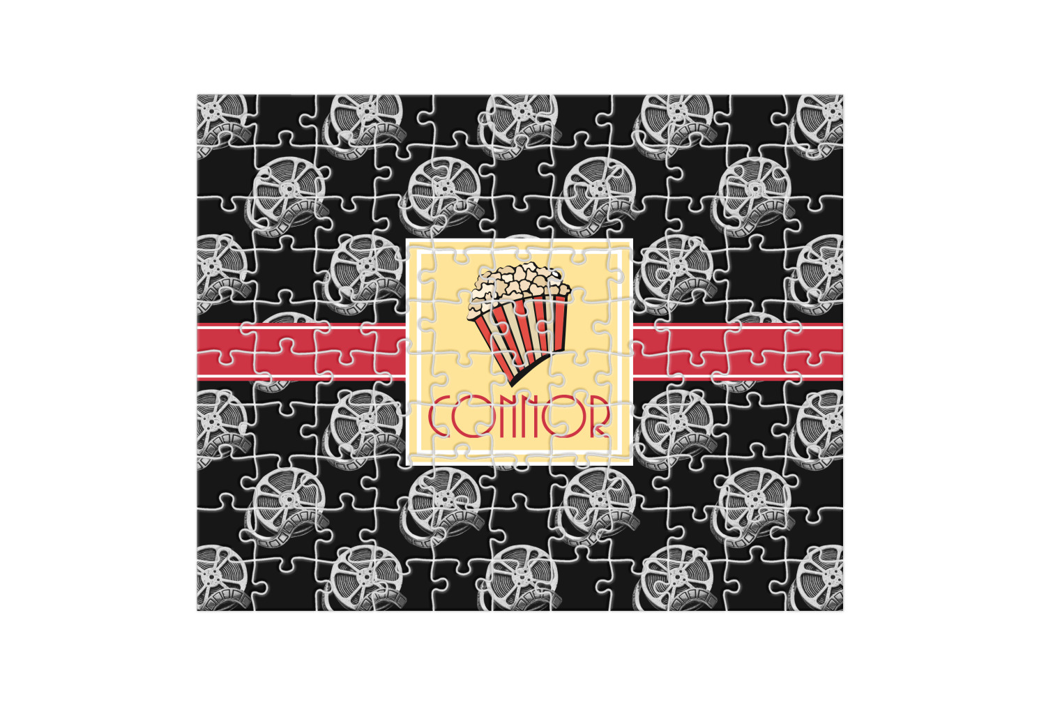 This fun design features a black background with movie reels repeating. On top there is a bright red ribbon with a soft yellow frame. In the frame there is a fun popcorn graphic with your personalization underneath. The yellow and red give the perfect contrast against the dark black. The font even gives you a classic movie feel.