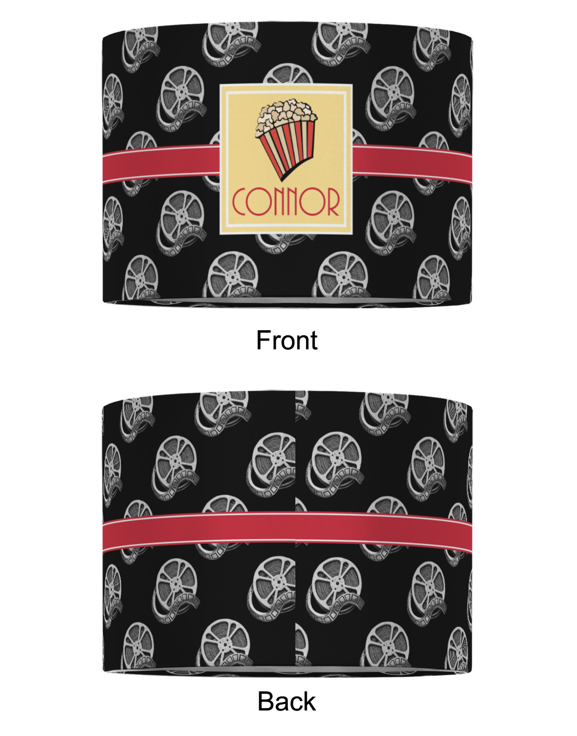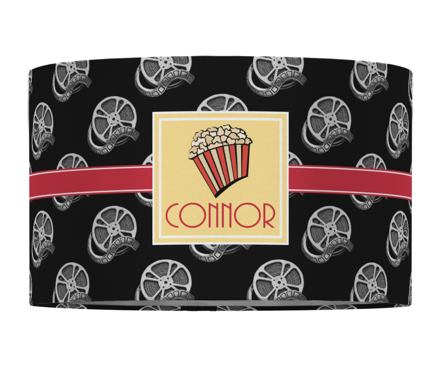 This fun design features a black background with movie reels repeating. On top there is a bright red ribbon with a soft yellow frame. In the frame there is a fun popcorn graphic with your personalization underneath. The yellow and red give the perfect contrast against the dark black. The font even gives you a classic movie feel.