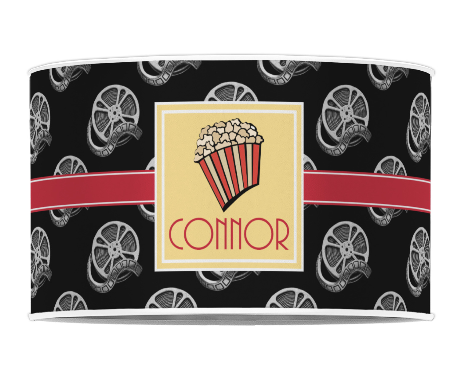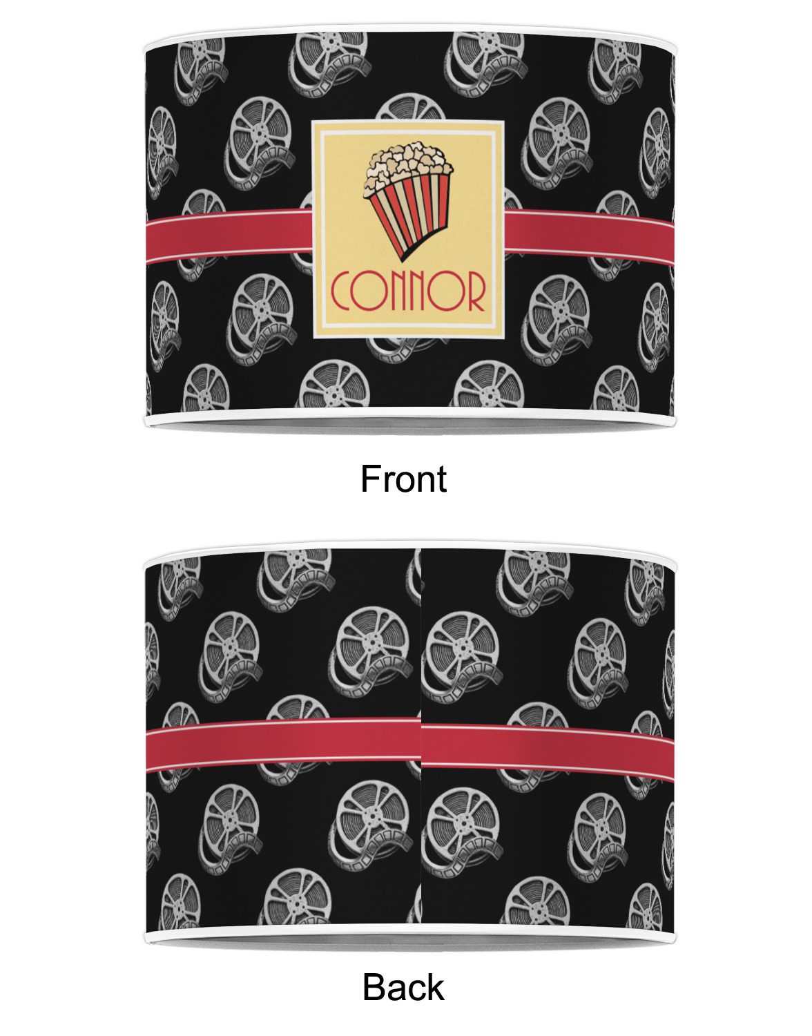 This fun design features a black background with movie reels repeating. On top there is a bright red ribbon with a soft yellow frame. In the frame there is a fun popcorn graphic with your personalization underneath. The yellow and red give the perfect contrast against the dark black. The font even gives you a classic movie feel.