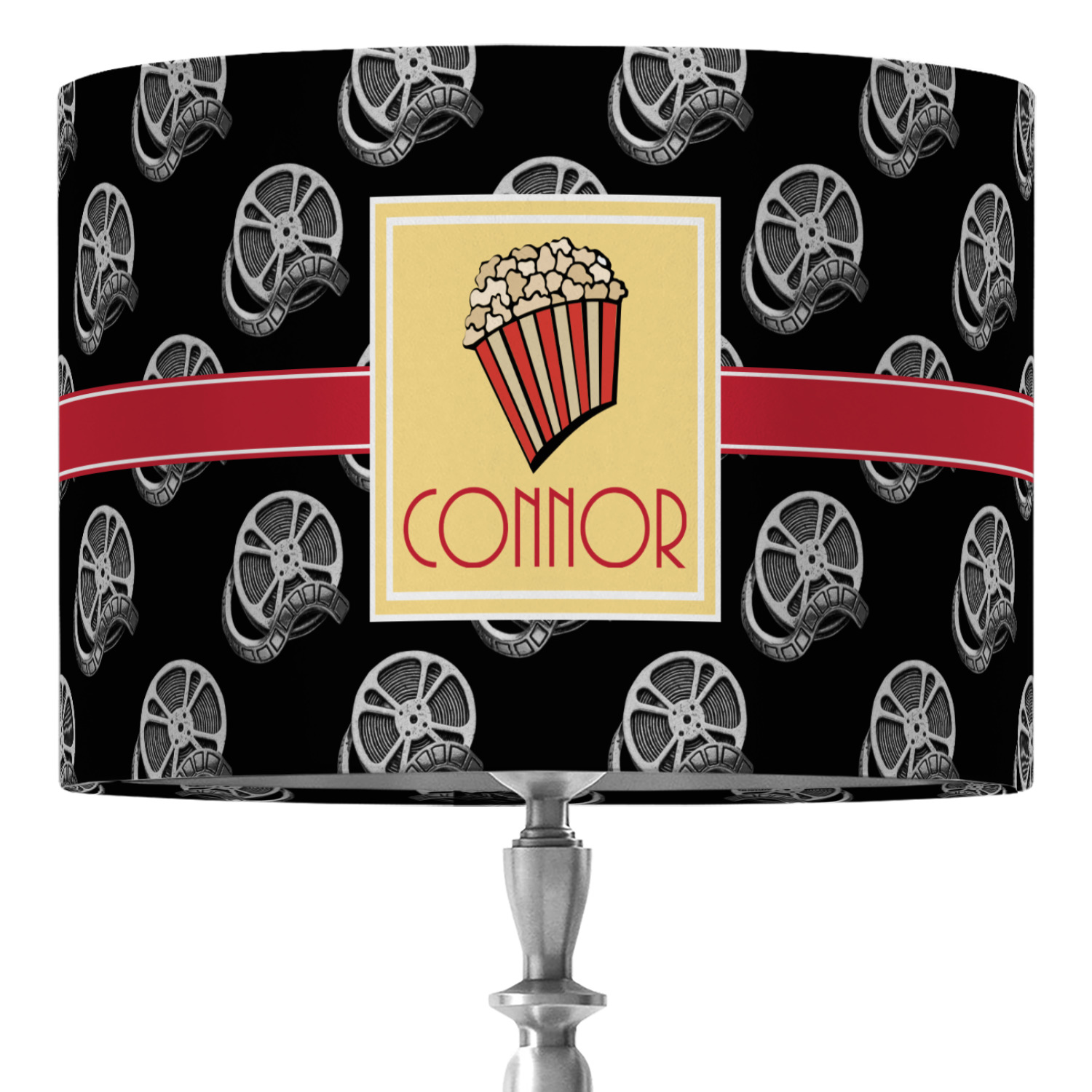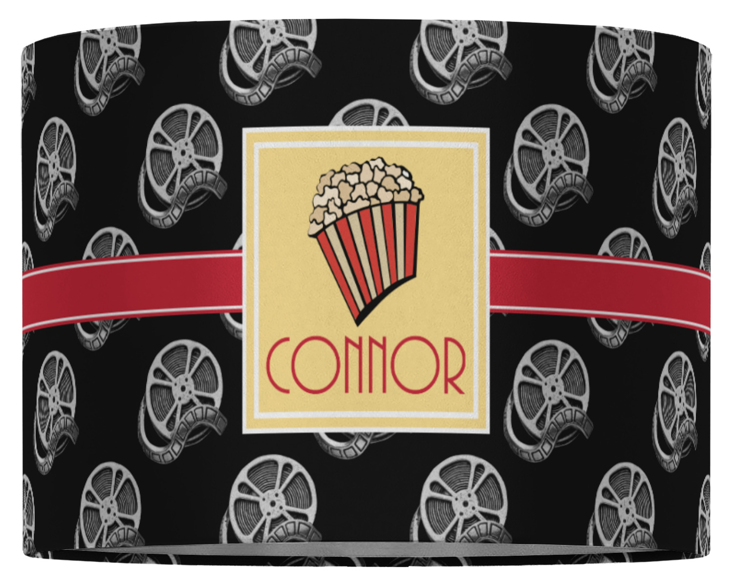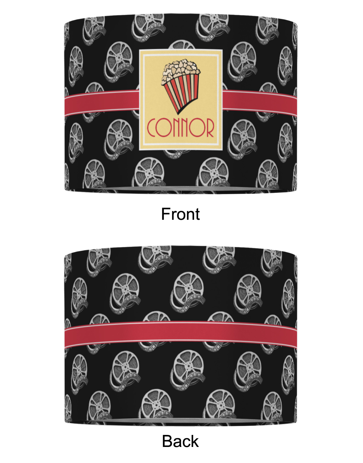 This fun design features a black background with movie reels repeating. On top there is a bright red ribbon with a soft yellow frame. In the frame there is a fun popcorn graphic with your personalization underneath. The yellow and red give the perfect contrast against the dark black. The font even gives you a classic movie feel.