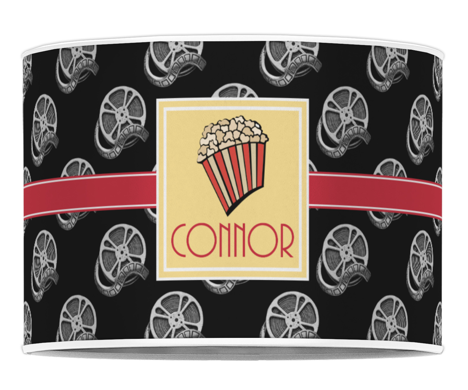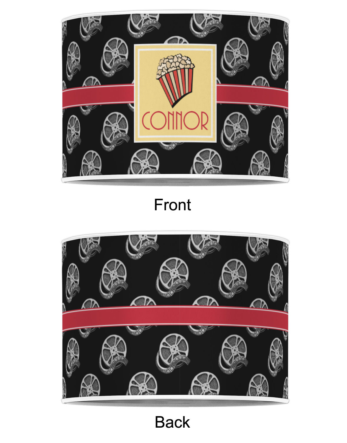 This fun design features a black background with movie reels repeating. On top there is a bright red ribbon with a soft yellow frame. In the frame there is a fun popcorn graphic with your personalization underneath. The yellow and red give the perfect contrast against the dark black. The font even gives you a classic movie feel.