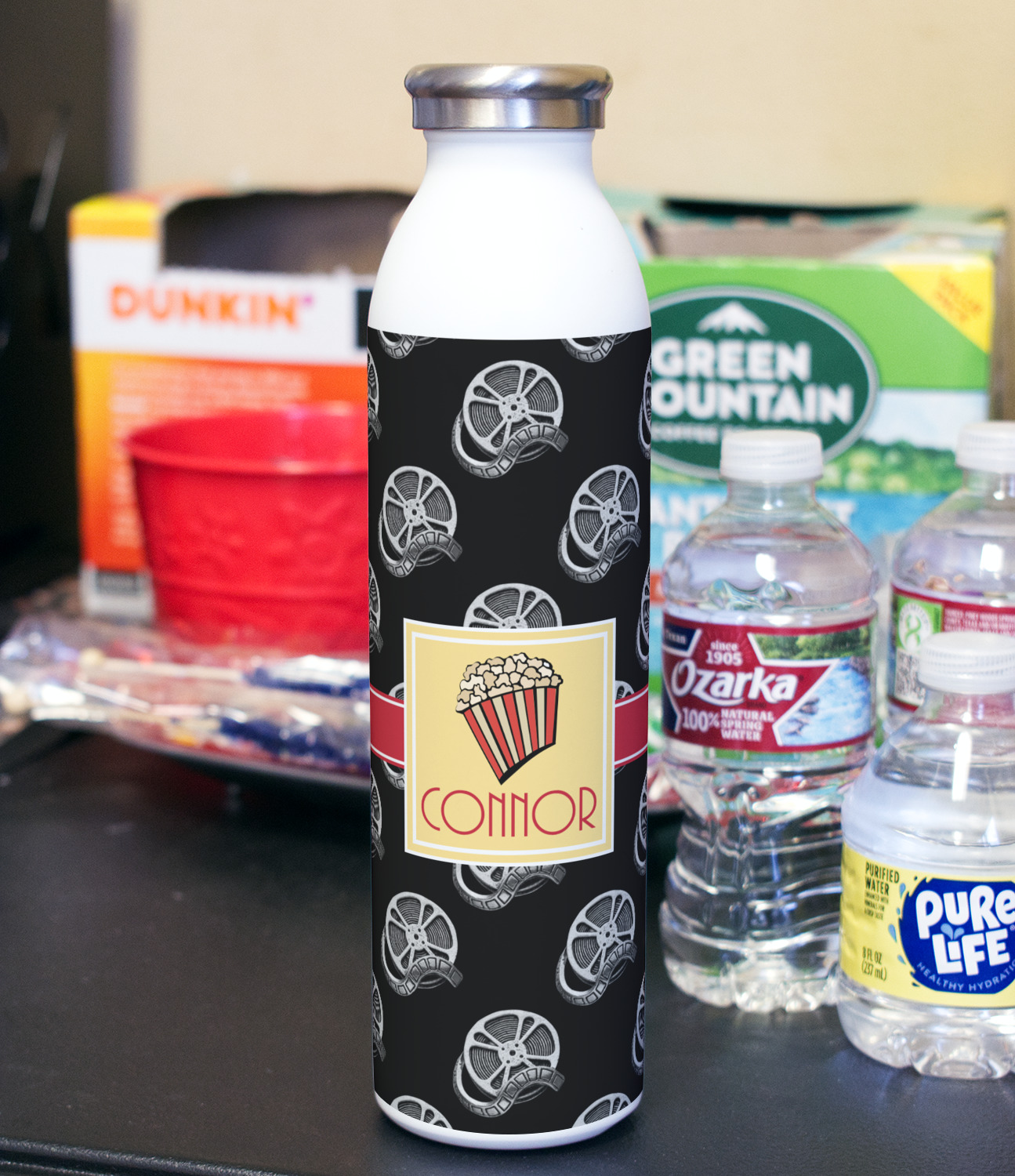 This fun design features a black background with movie reels repeating. On top there is a bright red ribbon with a soft yellow frame. In the frame there is a fun popcorn graphic with your personalization underneath. The yellow and red give the perfect contrast against the dark black. The font even gives you a classic movie feel.