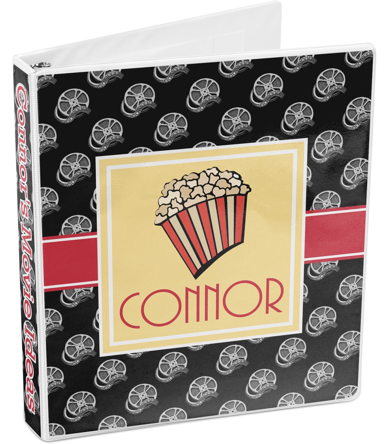 This fun design features a black background with movie reels repeating. On top there is a bright red ribbon with a soft yellow frame. In the frame there is a fun popcorn graphic with your personalization underneath. The yellow and red give the perfect contrast against the dark black. The font even gives you a classic movie feel.