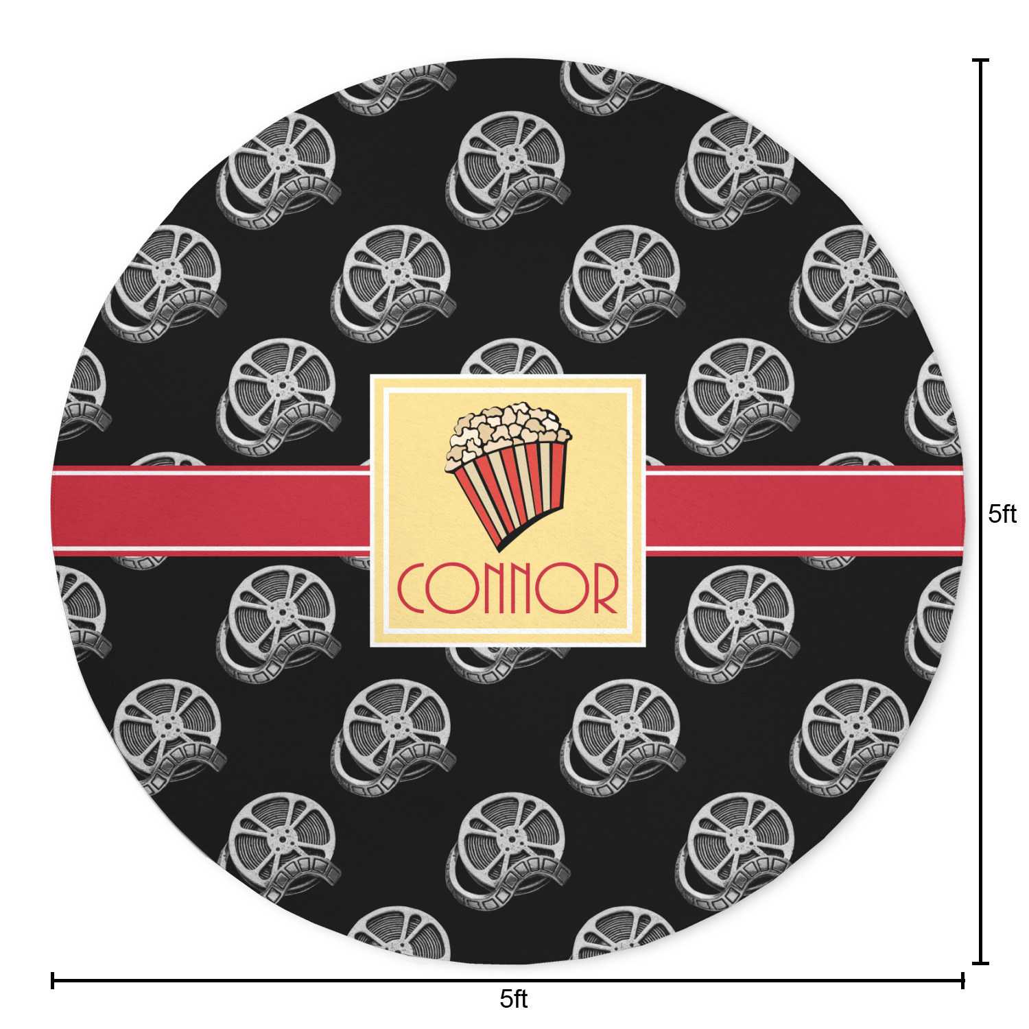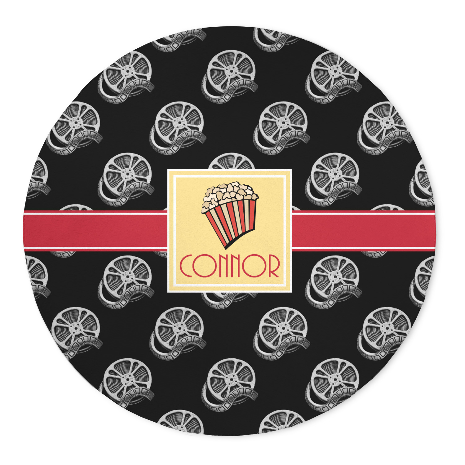 This fun design features a black background with movie reels repeating. On top there is a bright red ribbon with a soft yellow frame. In the frame there is a fun popcorn graphic with your personalization underneath. The yellow and red give the perfect contrast against the dark black. The font even gives you a classic movie feel.