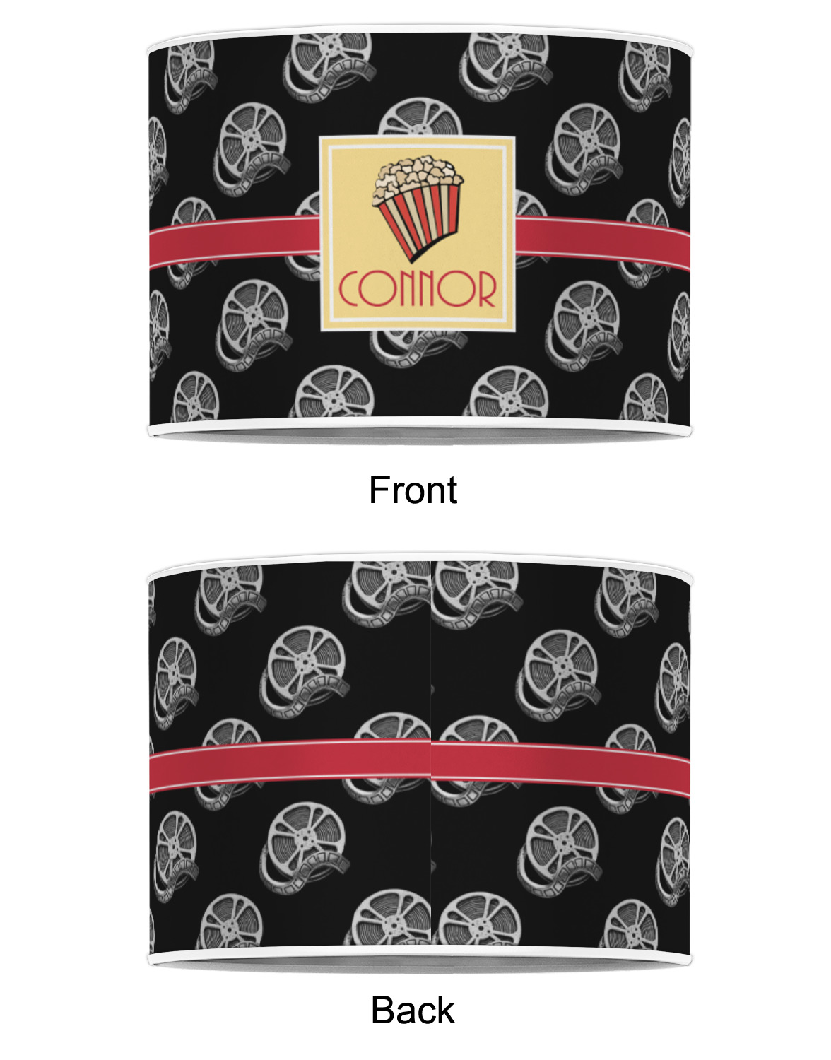 This fun design features a black background with movie reels repeating. On top there is a bright red ribbon with a soft yellow frame. In the frame there is a fun popcorn graphic with your personalization underneath. The yellow and red give the perfect contrast against the dark black. The font even gives you a classic movie feel.