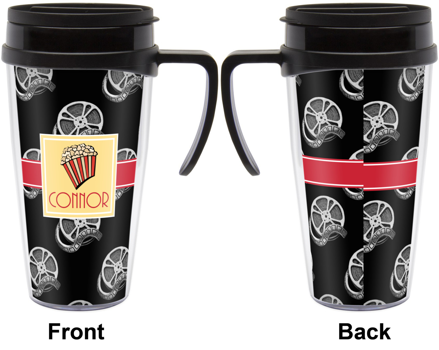 This fun design features a black background with movie reels repeating. On top there is a bright red ribbon with a soft yellow frame. In the frame there is a fun popcorn graphic with your personalization underneath. The yellow and red give the perfect contrast against the dark black. The font even gives you a classic movie feel.