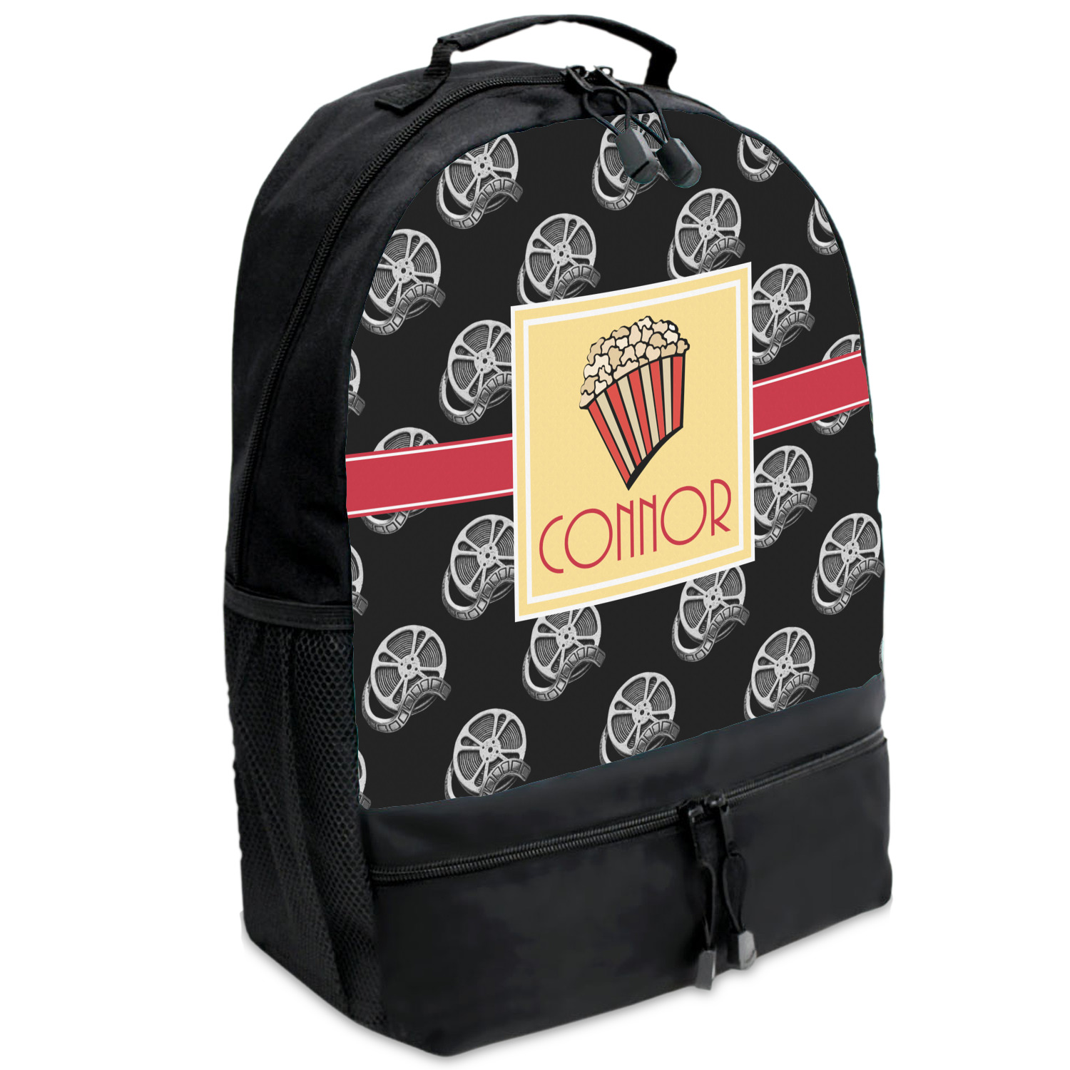This fun design features a black background with movie reels repeating. On top there is a bright red ribbon with a soft yellow frame. In the frame there is a fun popcorn graphic with your personalization underneath. The yellow and red give the perfect contrast against the dark black. The font even gives you a classic movie feel.