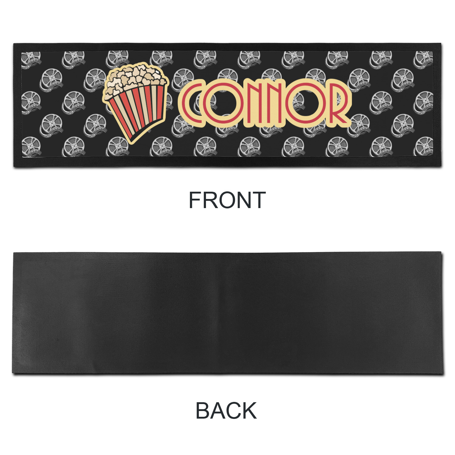 This fun design features a black background with movie reels repeating. On top there is a bright red ribbon with a soft yellow frame. In the frame there is a fun popcorn graphic with your personalization underneath. The yellow and red give the perfect contrast against the dark black. The font even gives you a classic movie feel.