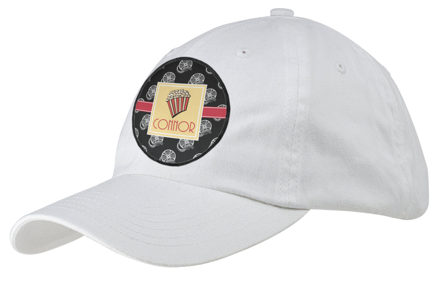 This fun design features a black background with movie reels repeating. On top there is a bright red ribbon with a soft yellow frame. In the frame there is a fun popcorn graphic with your personalization underneath. The yellow and red give the perfect contrast against the dark black. The font even gives you a classic movie feel.