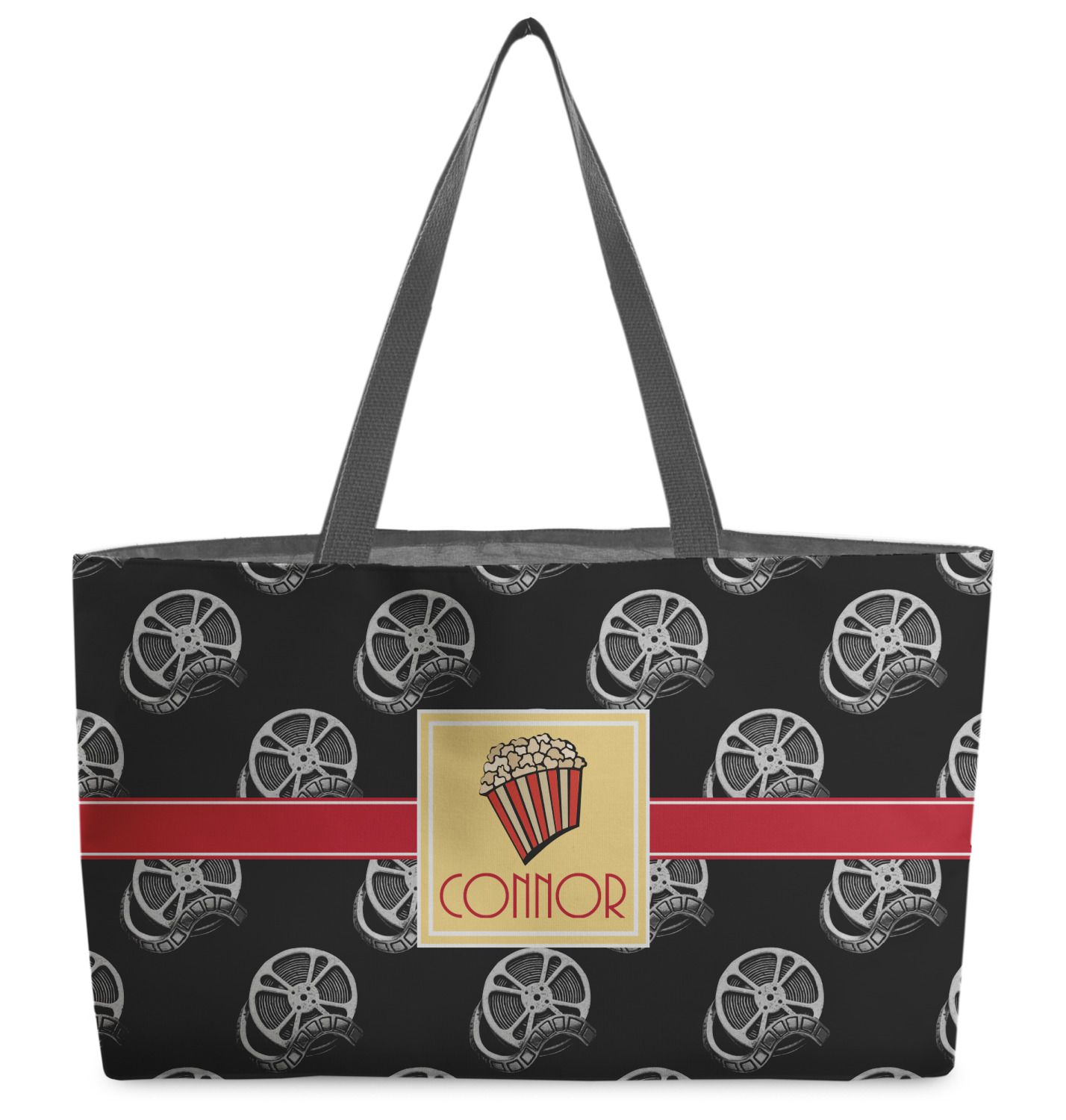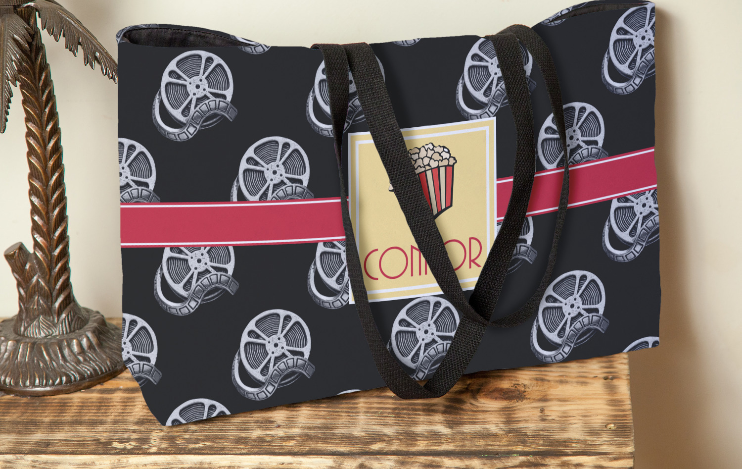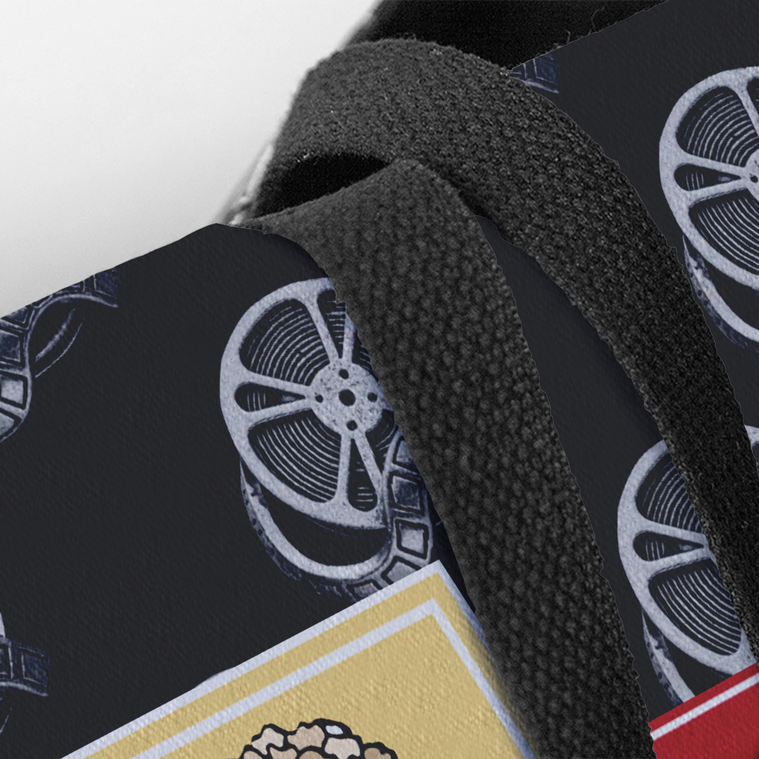 This fun design features a black background with movie reels repeating. On top there is a bright red ribbon with a soft yellow frame. In the frame there is a fun popcorn graphic with your personalization underneath. The yellow and red give the perfect contrast against the dark black. The font even gives you a classic movie feel.