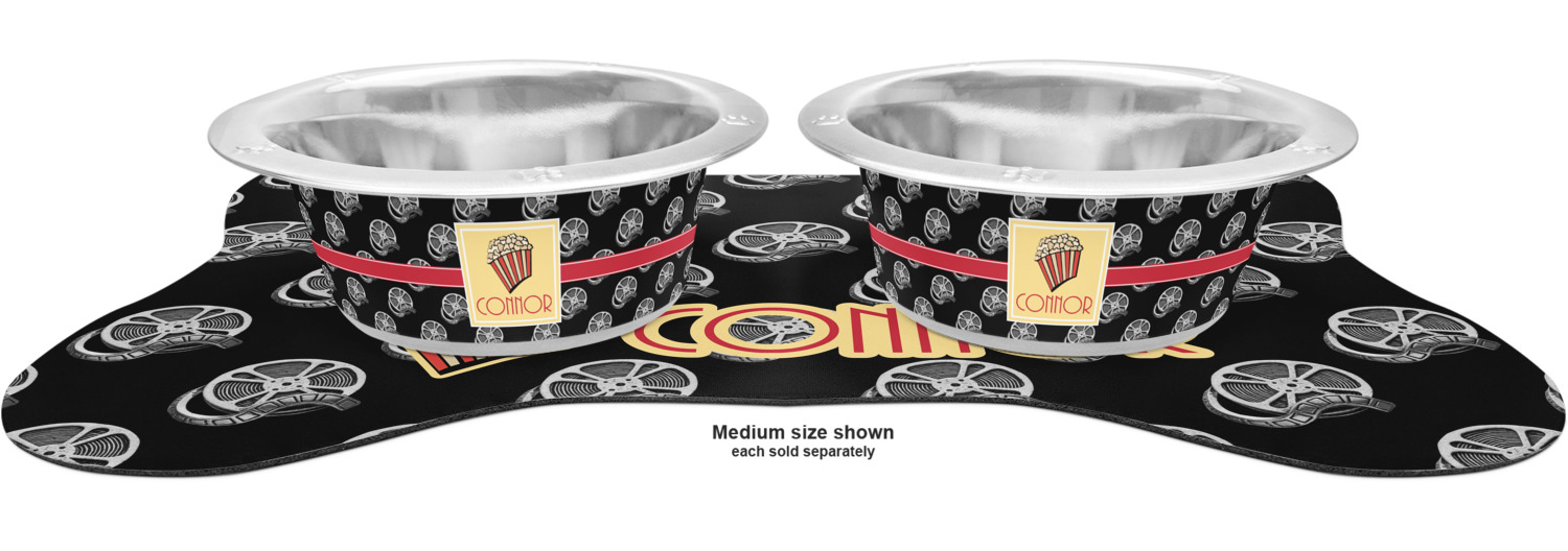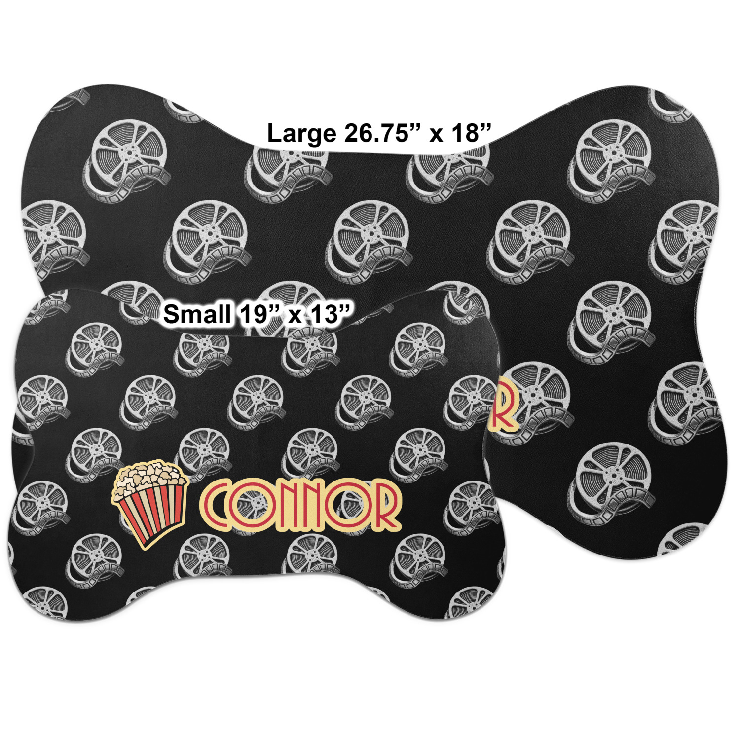 The top of this mat displays your custom design, as it is printed on polyester. To prevent slippage, the underside of the mat is made of rubber. We offer a small dog food mat, suitable for smaller dogs and a large dog food mat for bigger breeds. The small dog food mat is approximately 19 by 13 inches, while the large dog feeding mat measures at approximately 26.75 by 18 inches. Both personalized mats are ideally sized to fit two dog bowls.