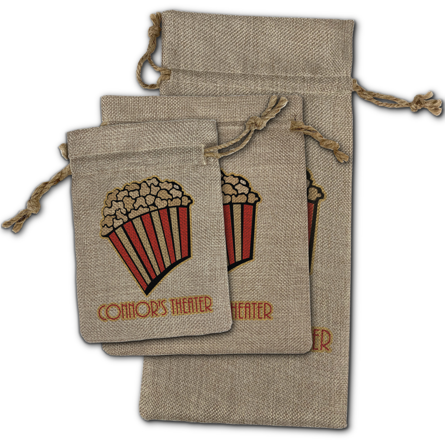 We sell our Burlap Gift Bags in 3 variant sized bags. Made with burlap polyester, each personalized bag can be secured with a twine drawstring pull. Your custom design is available to print on one side or both sides - completely up to you! The sizes of the bags measure approximately 4.5" x 6.5" for the smallest size, 6.5" x 8.0" for the medium size, and 6.5" x 13.5" for the large-sized bag.