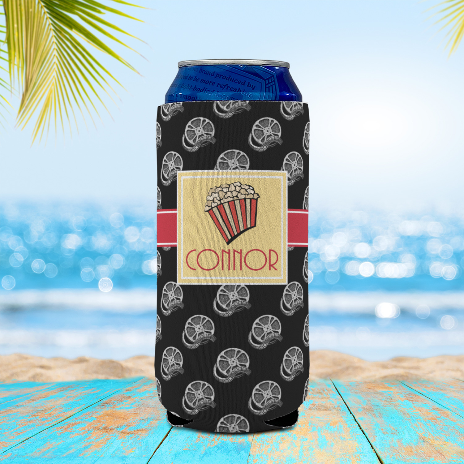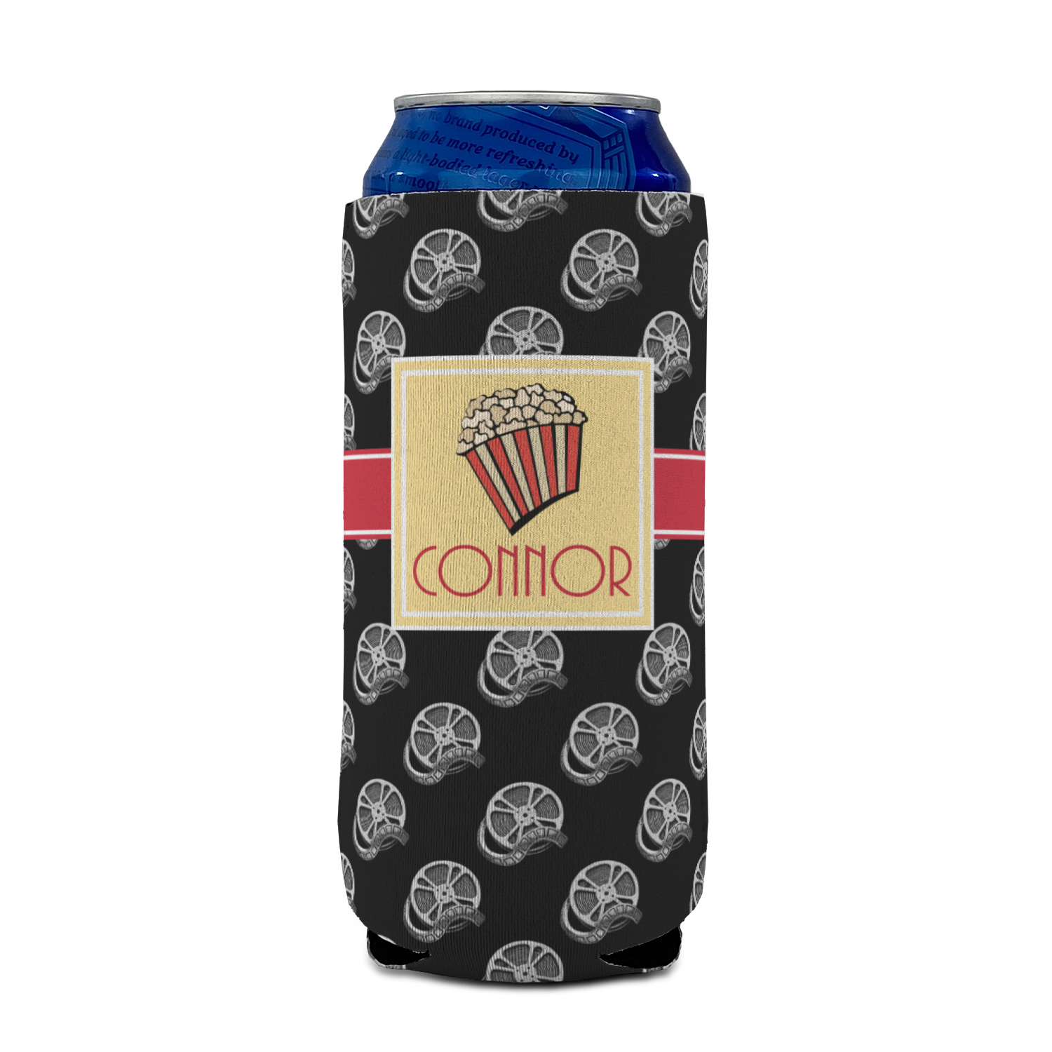 This fun design features a black background with movie reels repeating. On top there is a bright red ribbon with a soft yellow frame. In the frame there is a fun popcorn graphic with your personalization underneath. The yellow and red give the perfect contrast against the dark black. The font even gives you a classic movie feel.