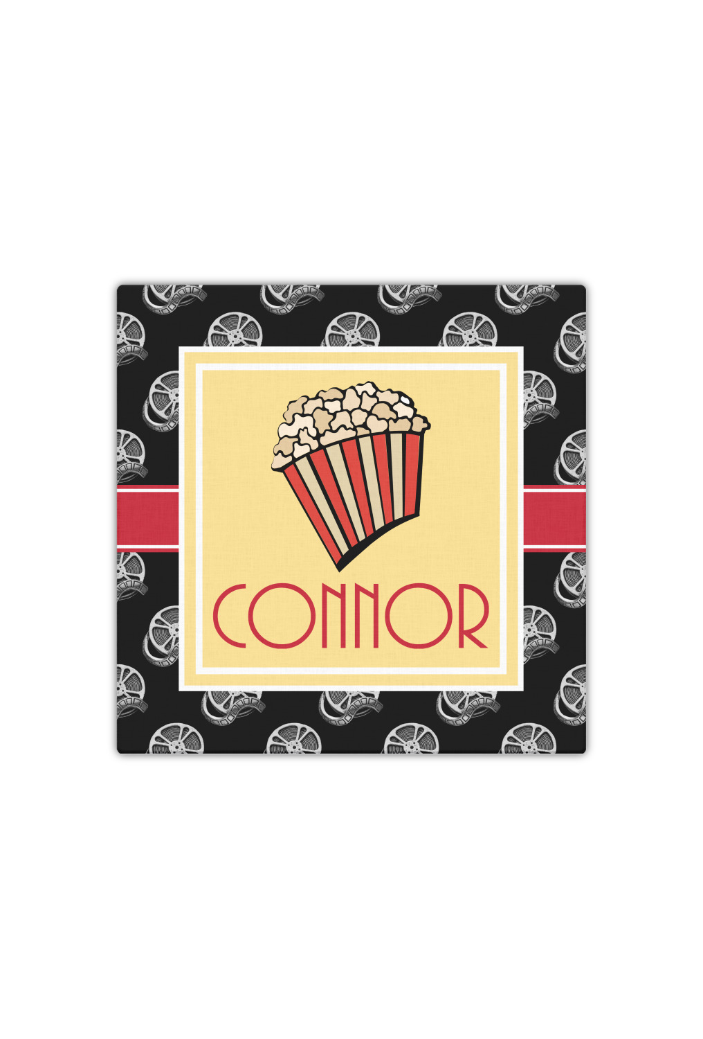 This fun design features a black background with movie reels repeating. On top there is a bright red ribbon with a soft yellow frame. In the frame there is a fun popcorn graphic with your personalization underneath. The yellow and red give the perfect contrast against the dark black. The font even gives you a classic movie feel.
