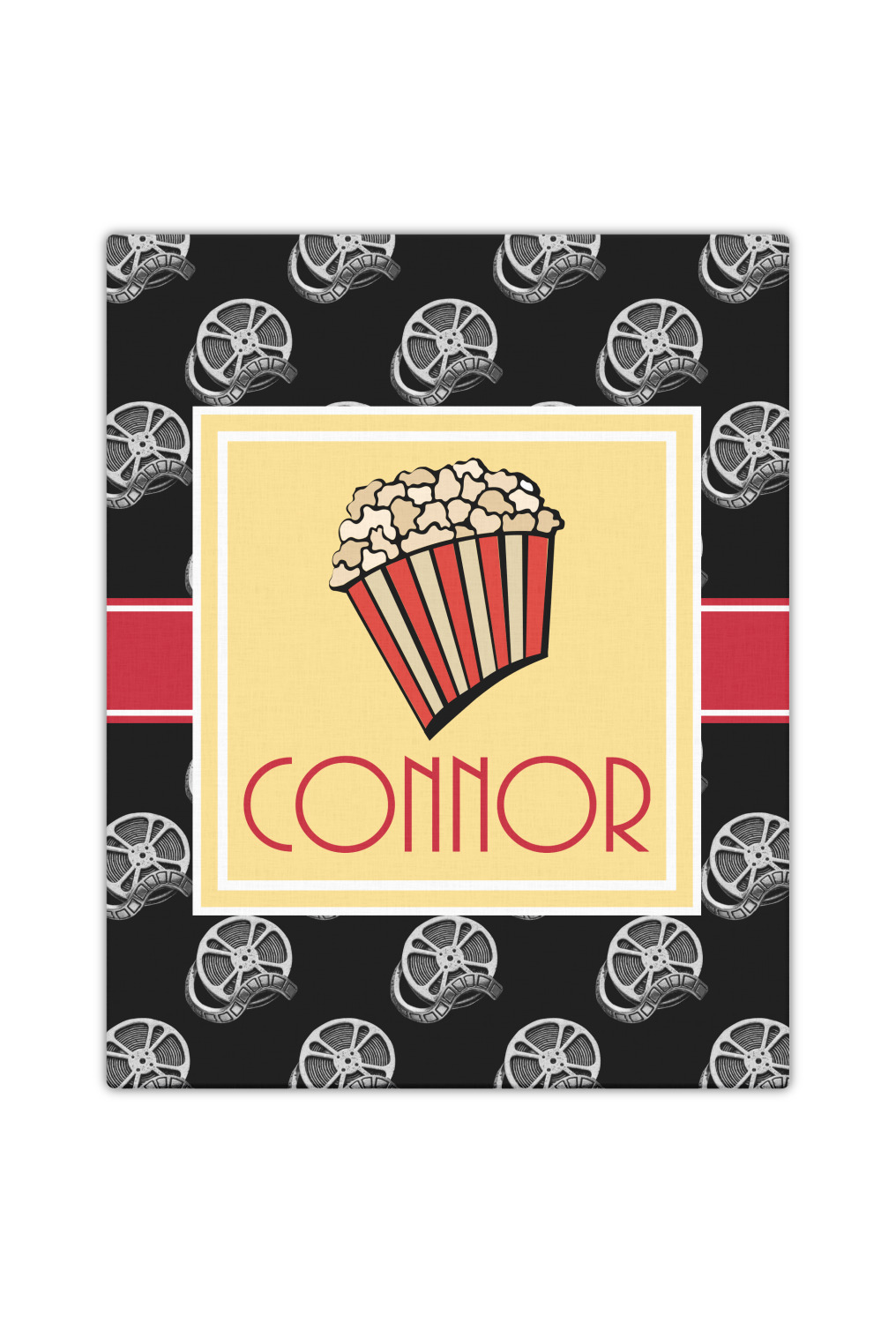 This fun design features a black background with movie reels repeating. On top there is a bright red ribbon with a soft yellow frame. In the frame there is a fun popcorn graphic with your personalization underneath. The yellow and red give the perfect contrast against the dark black. The font even gives you a classic movie feel.