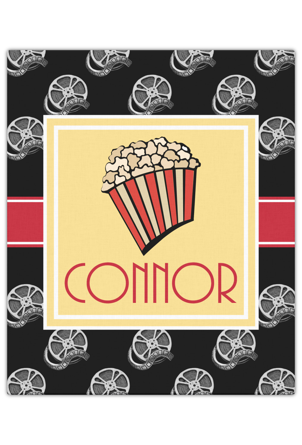 This fun design features a black background with movie reels repeating. On top there is a bright red ribbon with a soft yellow frame. In the frame there is a fun popcorn graphic with your personalization underneath. The yellow and red give the perfect contrast against the dark black. The font even gives you a classic movie feel.