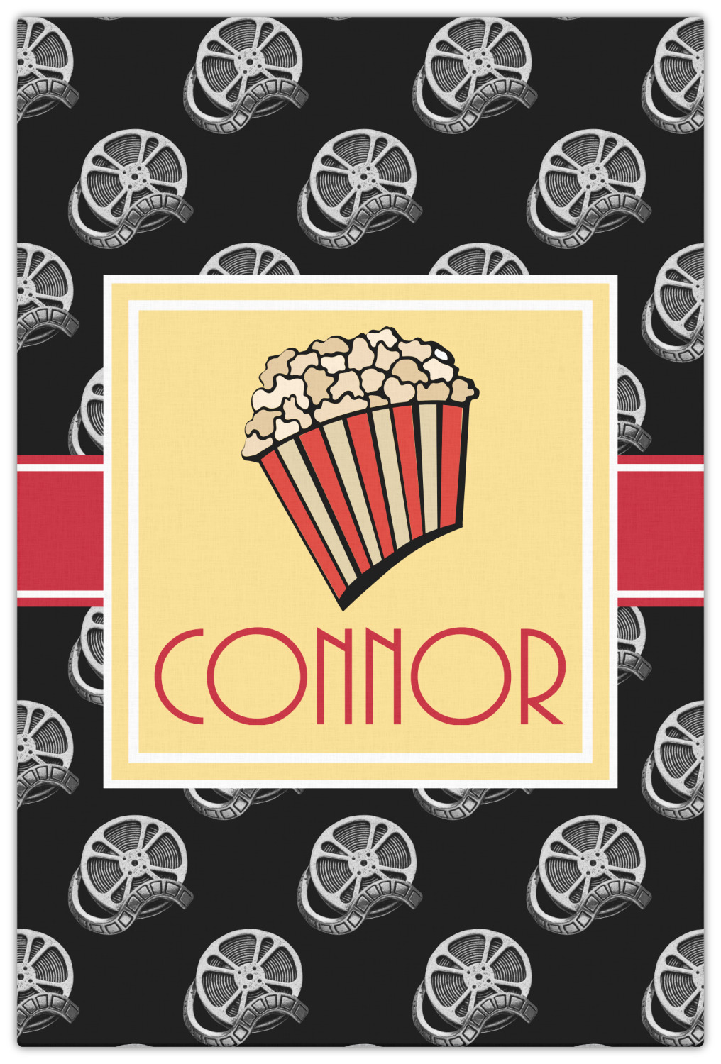 This fun design features a black background with movie reels repeating. On top there is a bright red ribbon with a soft yellow frame. In the frame there is a fun popcorn graphic with your personalization underneath. The yellow and red give the perfect contrast against the dark black. The font even gives you a classic movie feel.